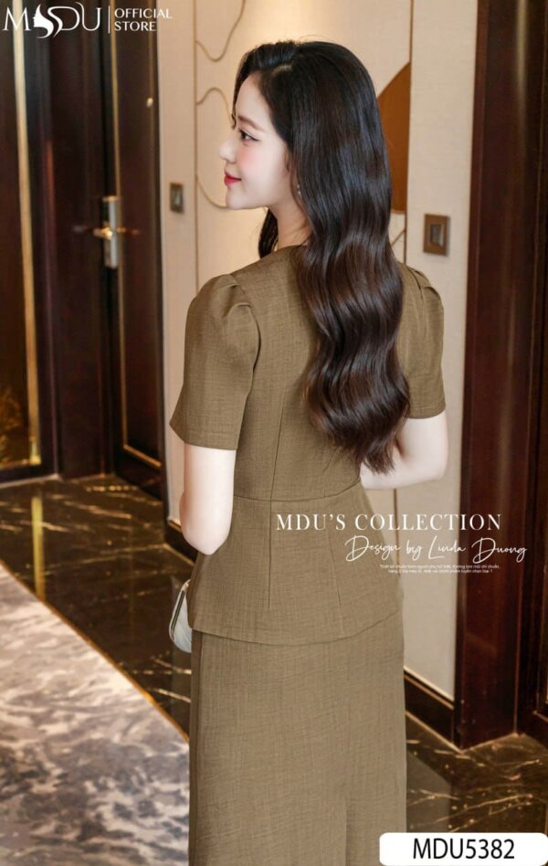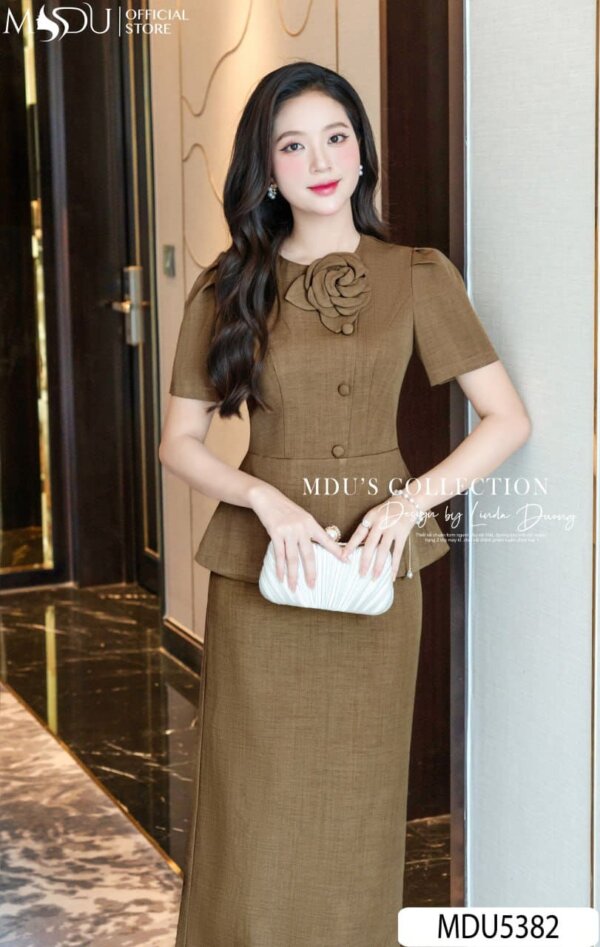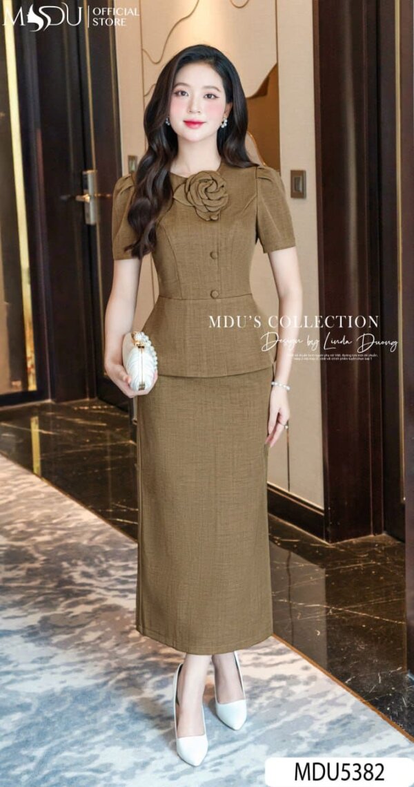 MDU5382 channels timeless sophistication through its warm amber tone and impeccable tailoring. The fitted top features delicately puffed sleeves and covered buttons, accentuating an hourglass silhouette. A sculpted rose applique at the neckline adds an artistic, feminine focal point, while the long pencil skirt elongates the form with effortless grace. Ideal for business settings, elegant luncheons, or formal receptions, this ensemble exudes quiet confidence and poised refinement — where every detail speaks of elegance and intention.