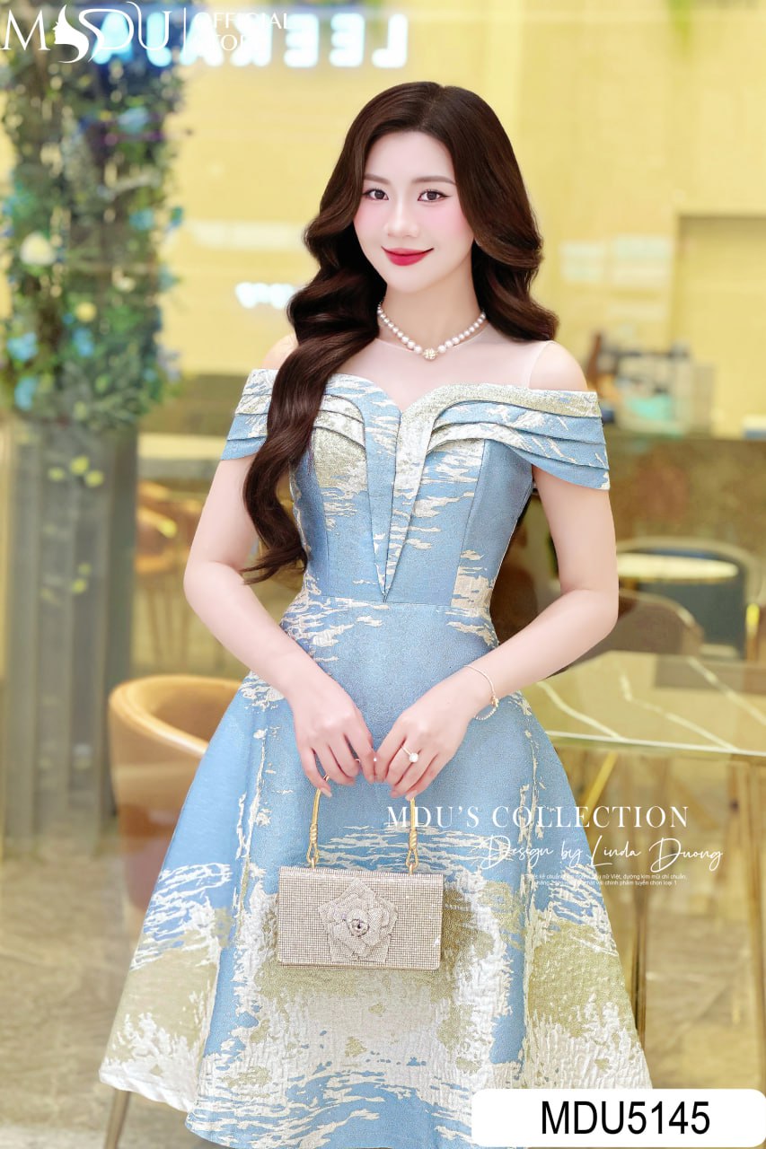A luminous brocade midi dress in sky blue and gold with an elegant off-shoulder neckline. MDU5145 radiates timeless grace and sophistication — ideal for special occasions or formal gatherings.