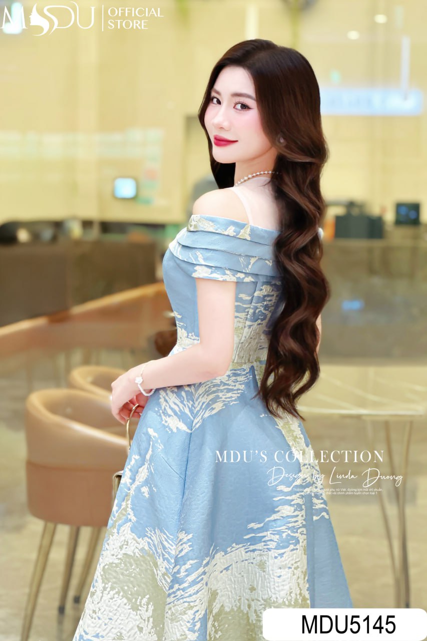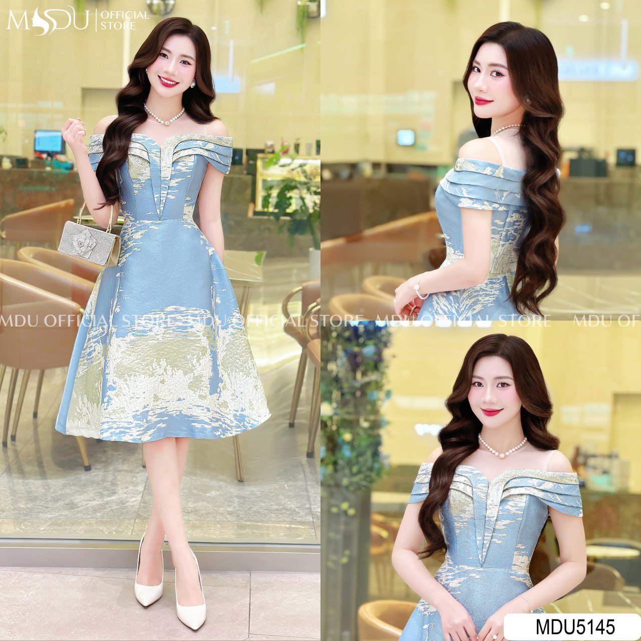 Design Highlights: MDU5145 embodies sophistication through its sculpted silhouette and shimmering craftsmanship. Designed in an ethereal sky blue tone with subtle golden undertones, this midi dress captures the light beautifully with every movement. The off-shoulder neckline gracefully accentuates the collarbones, while the tailored bodice enhances feminine curves. The pleated flared skirt offers a refined volume that flows effortlessly, ensuring timeless allure and poise. A perfect choice for evening receptions, formal luncheons, or celebratory events — this design balances elegance with modern charm.