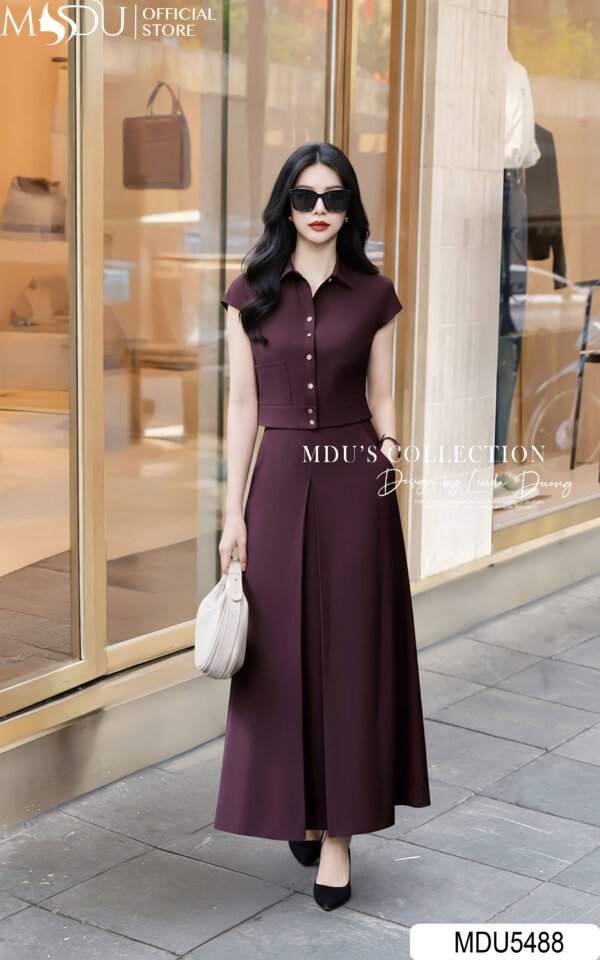 MDU5488 embodies timeless sophistication through its deep burgundy hue and immaculate tailoring. The design features a collared neckline with a row of pearl-accent buttons, adding subtle luxury to its clean, minimalist form. A fitted bodice transitions seamlessly into a gently flared maxi skirt, creating an elongating silhouette that moves gracefully with every step. Perfect for luncheons, elegant gatherings, or professional settings, this piece is a statement of quiet confidence and enduring elegance.