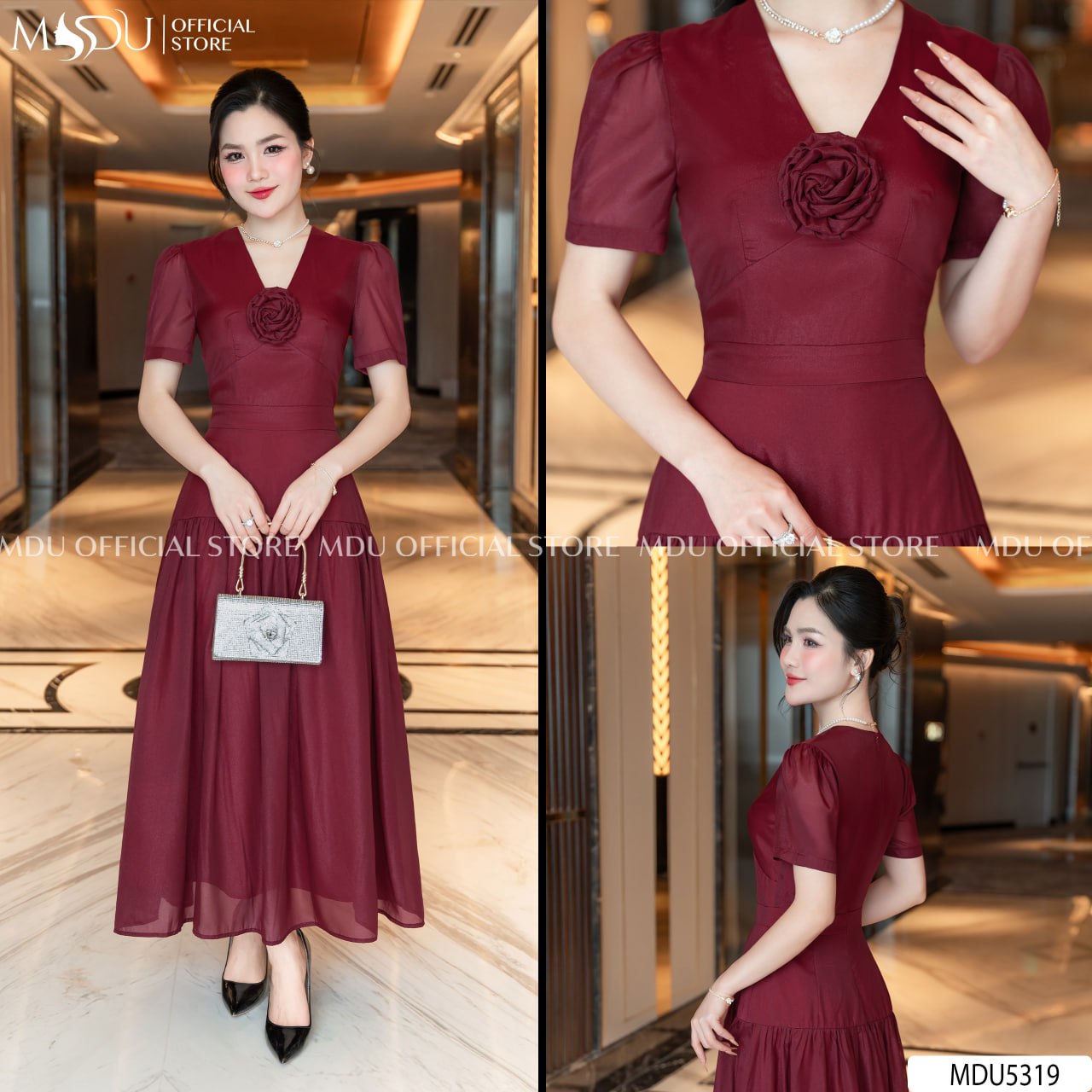 MDU5319 reflects timeless refinement through the charm of fluid motion and delicate structure. Crafted in a rich burgundy tone, this midi dress embraces elegance with its gentle V-neckline and softly puffed short sleeves. The fitted bodice transitions seamlessly into a gathered A-line skirt, creating a graceful drape that flatters every silhouette. A handcrafted rosette detail at the chest adds a romantic focal point, while the airy chiffon layers bring fluidity with every step. Perfect for semi-formal events, dinner gatherings, or daytime celebrations, this dress embodies the confidence and elegance of a modern lady.