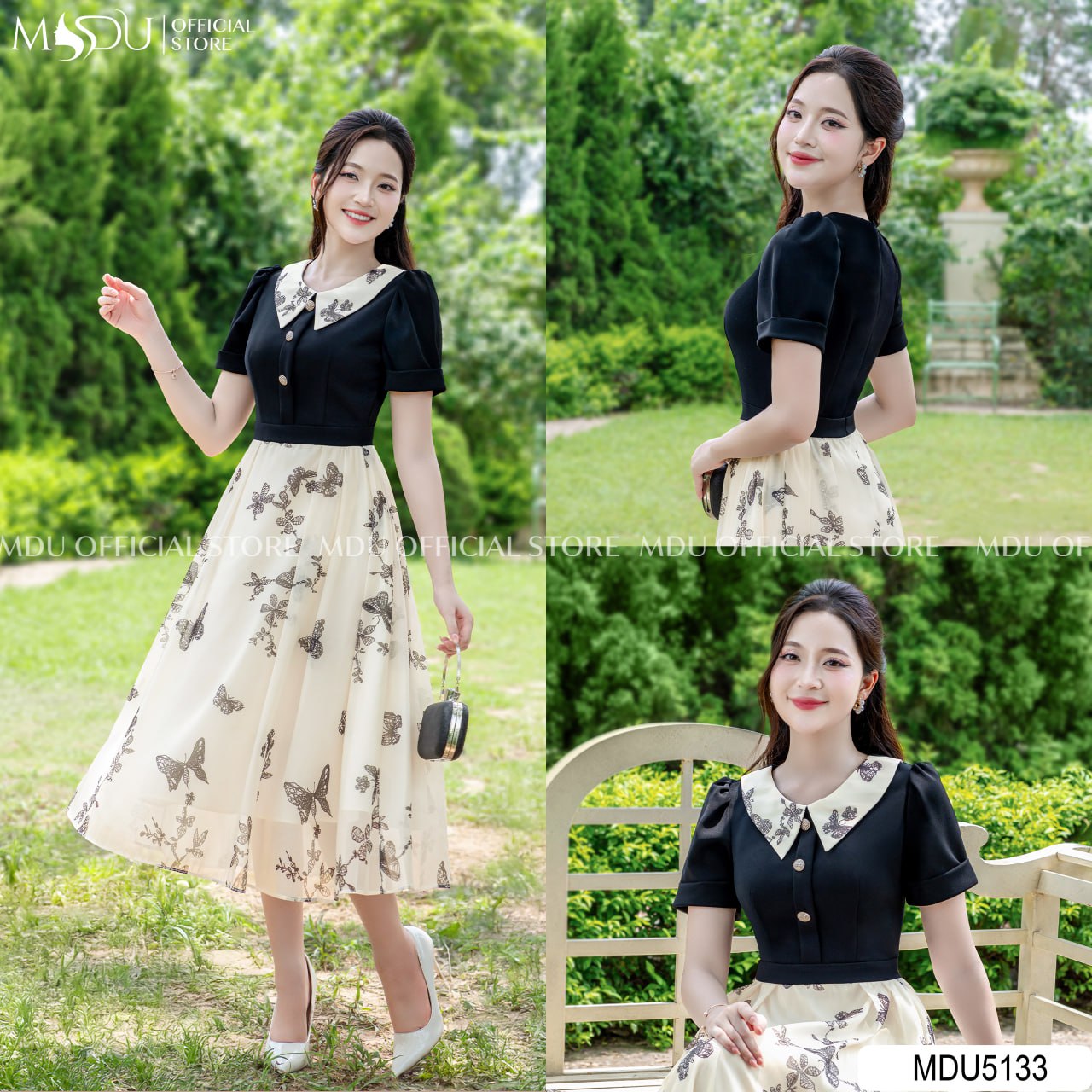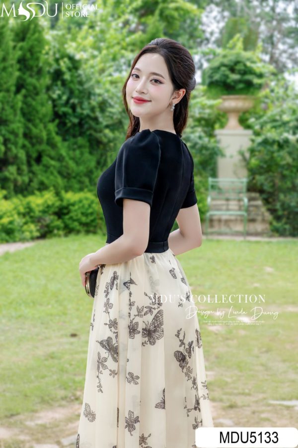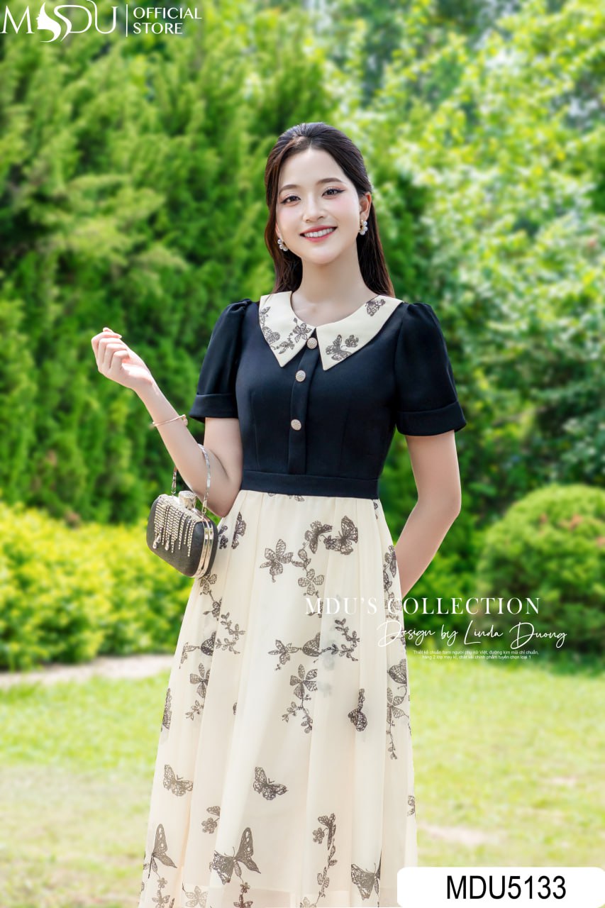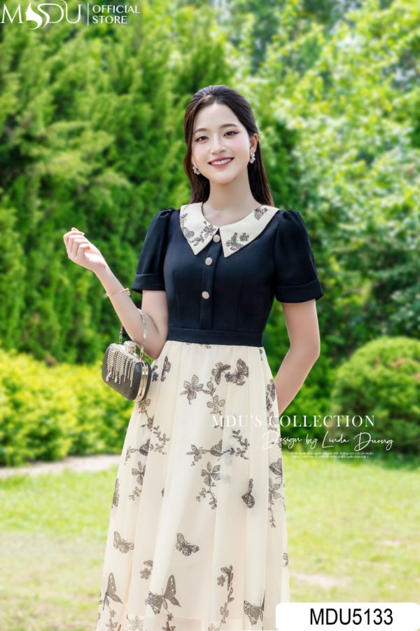 Design Highlights: MDU5133 is a poetic expression of grace and femininity. The design harmoniously combines a tailored black crepe bodice with an ivory chiffon skirt, creating a captivating play of contrast and movement. The delicate butterfly motifs on the skirt evoke a sense of freedom and lightness, while the rounded collar adorned with floral embroidery adds a touch of vintage romance. The structured waistline highlights the figure, flowing into a gently flared midi silhouette that sways with every step. Perfect for garden parties, brunches, or afternoon events, this dress embodies timeless sophistication with a whimsical edge.