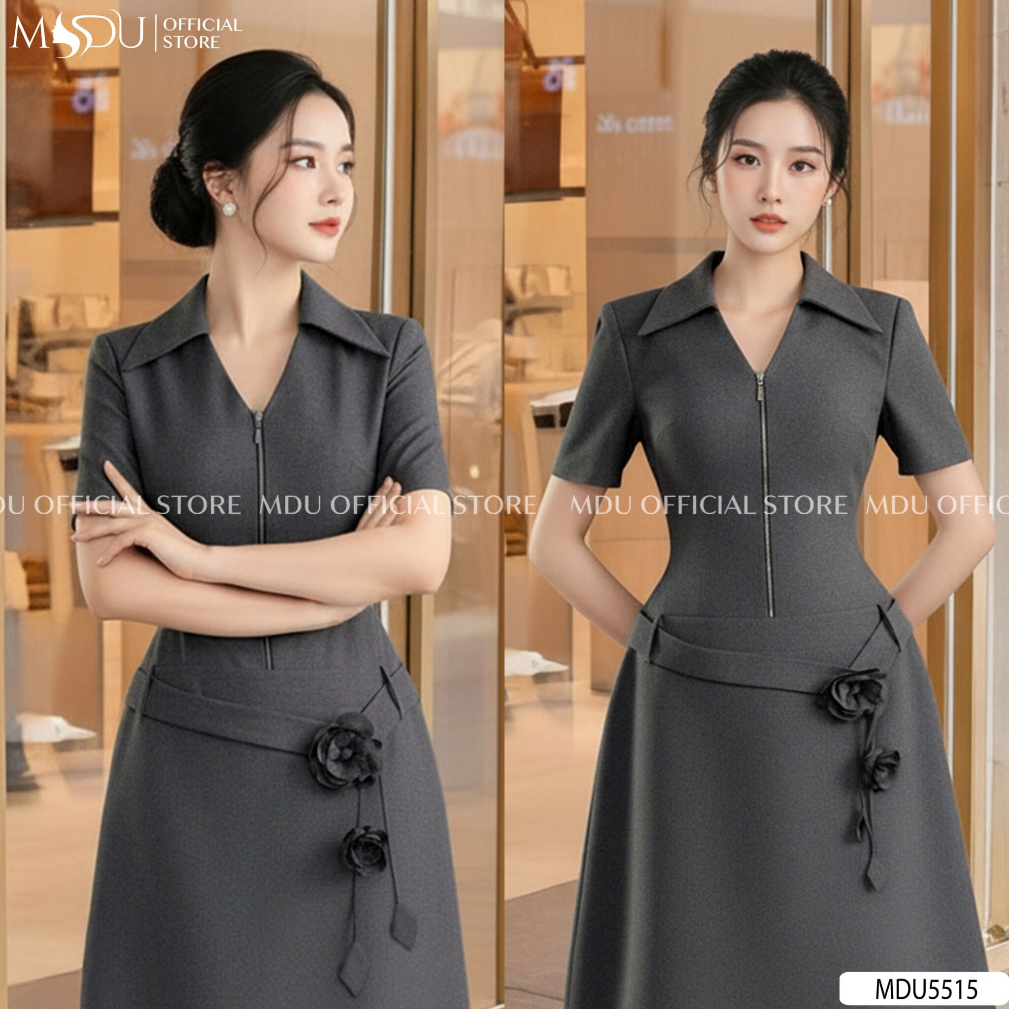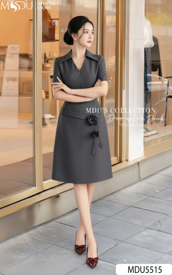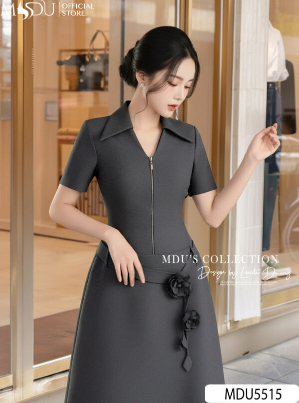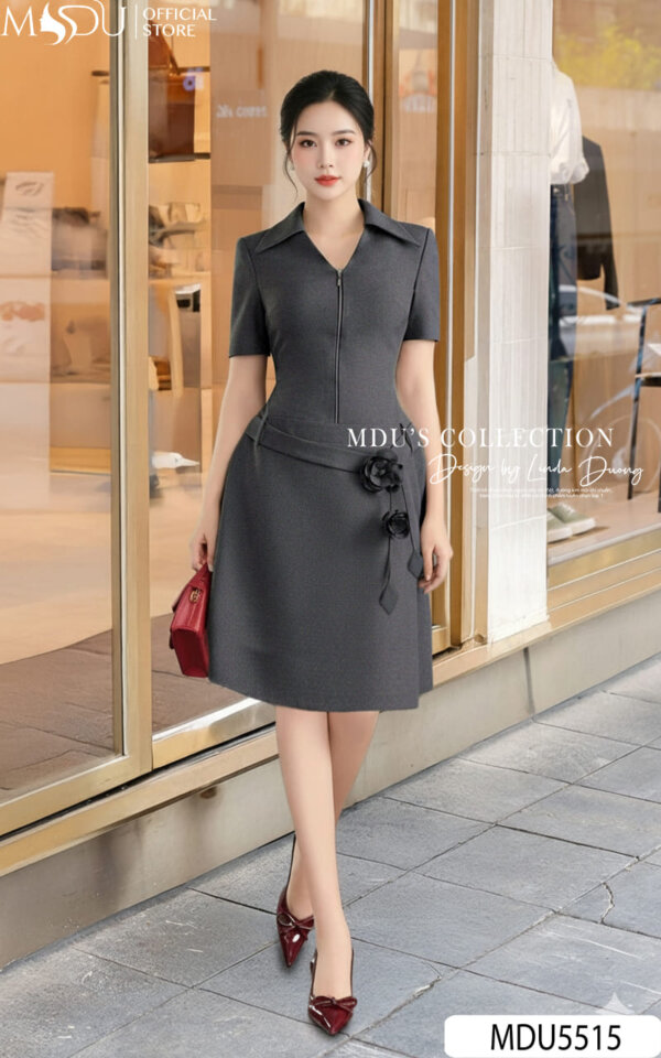 MDU5515 embodies a perfect blend of sophistication and practicality. Designed in a refined charcoal grey tone, the dress features a modern collared neckline with a sleek front zip that adds a touch of contemporary edge. The short sleeves and tailored waistline create a clean, flattering silhouette, while the minimalist belt detail adorned with a delicate floral accent completes the look with grace. This design effortlessly transitions from business settings to elegant evenings, showcasing quiet confidence and timeless charm.