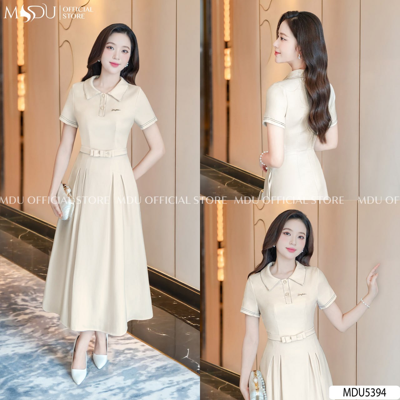 MDU5394 exudes quiet sophistication through its creamy tone and tailored silhouette. The collared neckline brings a polished charm, while the short sleeves and subtle stitching lines add an element of gentle refinement. A delicate waist belt defines feminine proportions, flowing into a softly pleated A-line skirt that moves gracefully with each step. Crafted for the modern woman who values elegance in simplicity, this design is ideal for business meetings, casual luncheons, or daytime events where understated luxury leaves a lasting impression.