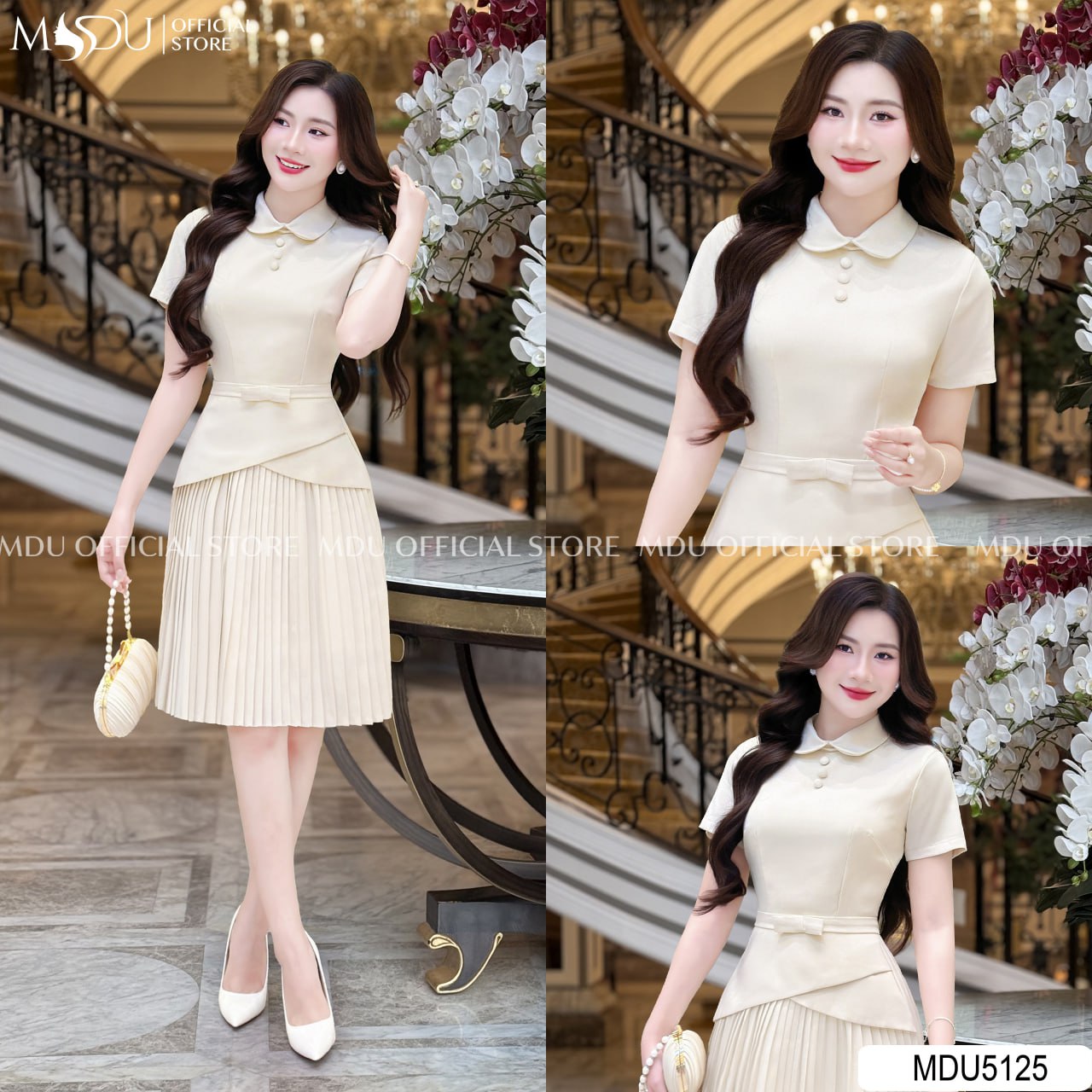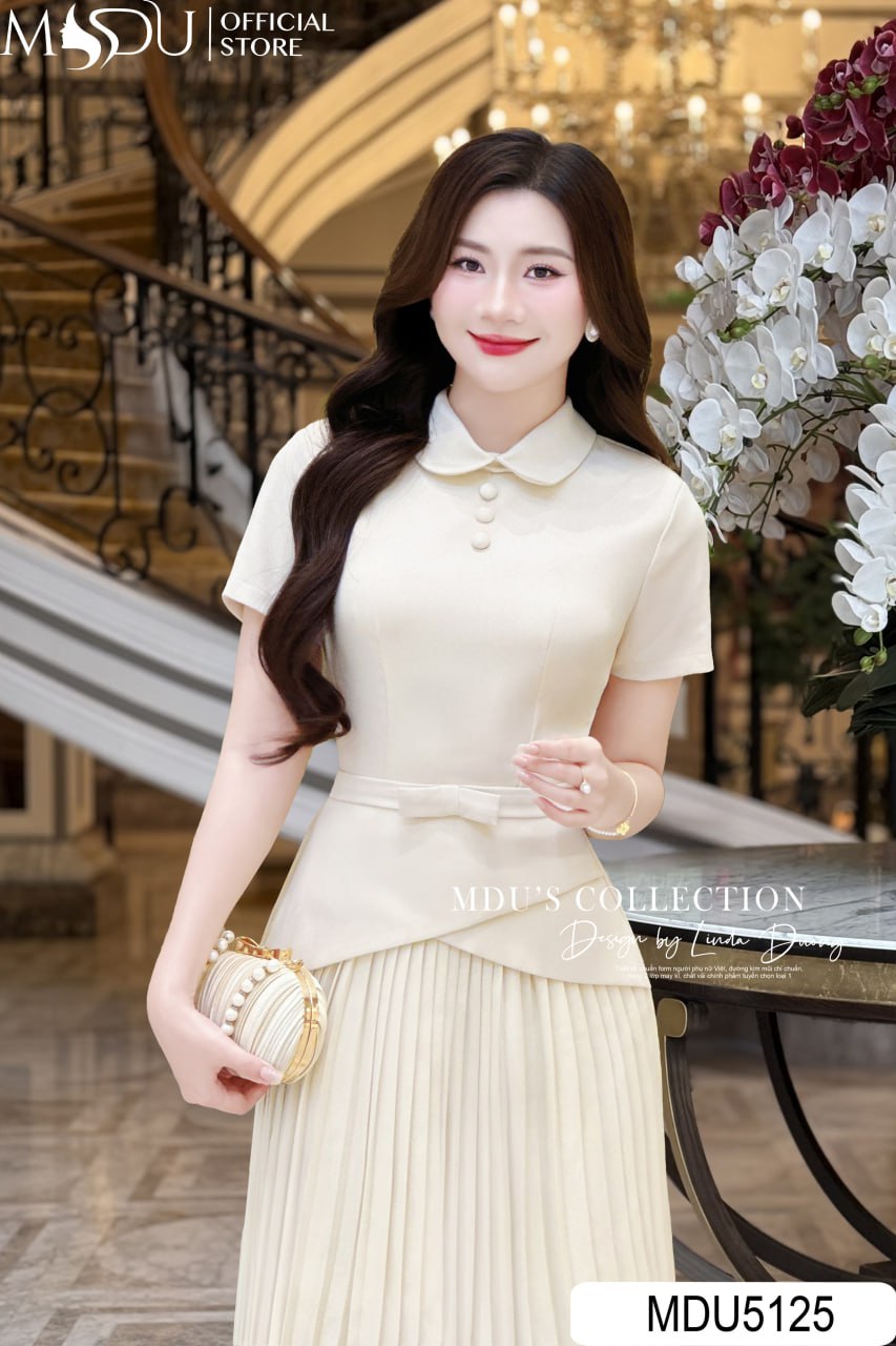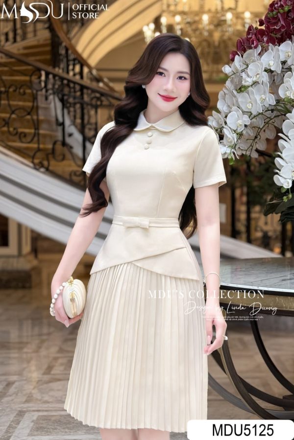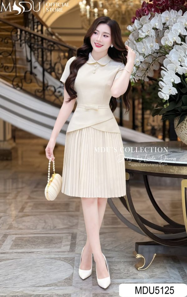 Refined and undeniably elegant, MDU5125 captures the beauty of simplicity with its luxurious cream hue and tailored silhouette. The design features a rounded collar and soft short sleeves that exude a gentle, polished femininity. The fitted waist transitions into an asymmetrical peplum overlay, perfectly complemented by a finely pleated A-line skirt that adds movement and texture. Every element — from the subtle waist bow to the precise stitching — reflects meticulous craftsmanship. Ideal for office wear, semi-formal gatherings, or afternoon meetings, this piece is the epitome of timeless grace for the modern lady.