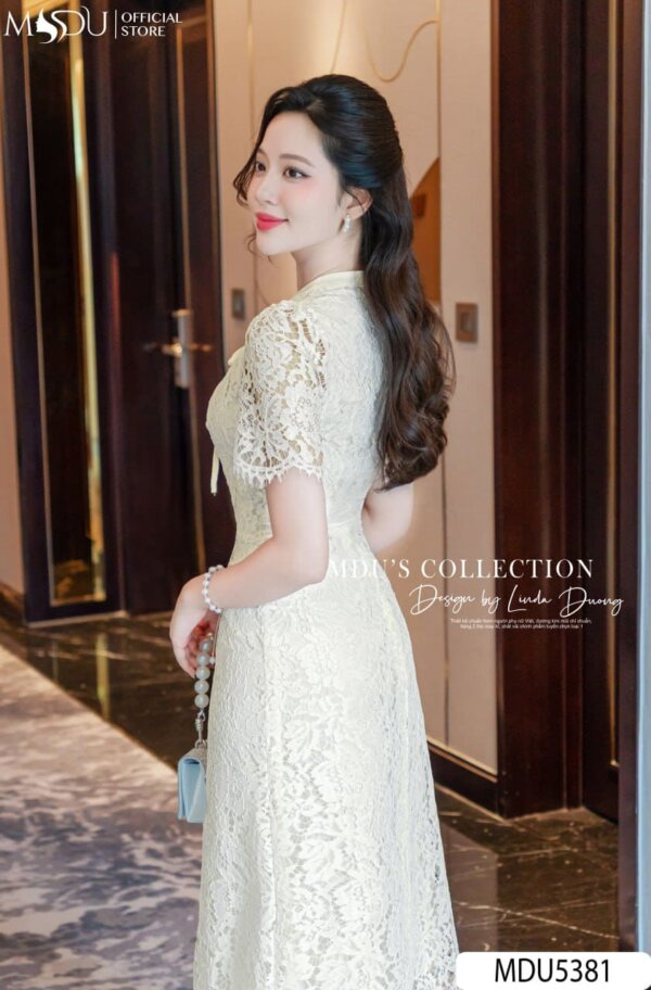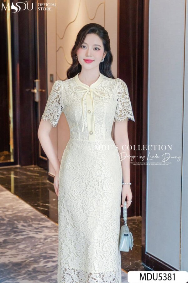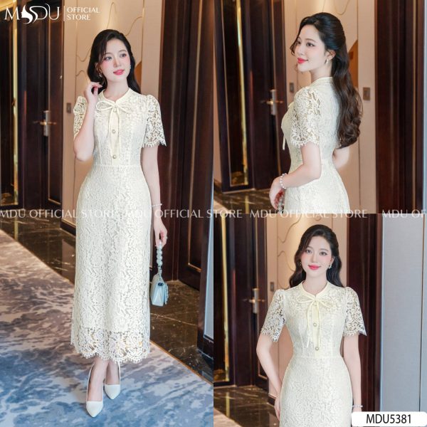 MDU5381 embodies the quiet beauty of classic sophistication. Rendered in a soft cream hue, the dress features intricate lace motifs layered over a smooth satin lining, creating a sense of light and texture. The fitted bodice, accentuated by delicate pearl buttons and a petite ribbon bow, evokes vintage charm with modern finesse. Short lace sleeves add a gentle touch of romance, while the midi-length hem with scalloped edges completes the look with graceful femininity. A perfect choice for afternoon tea, elegant luncheons, or semi-formal gatherings that call for refined poise.