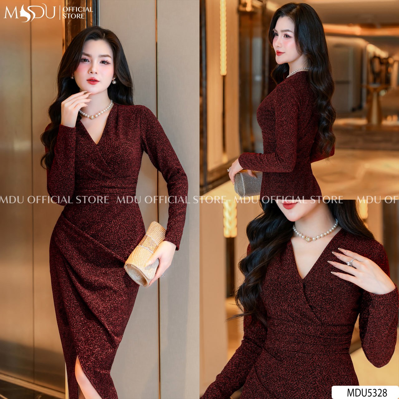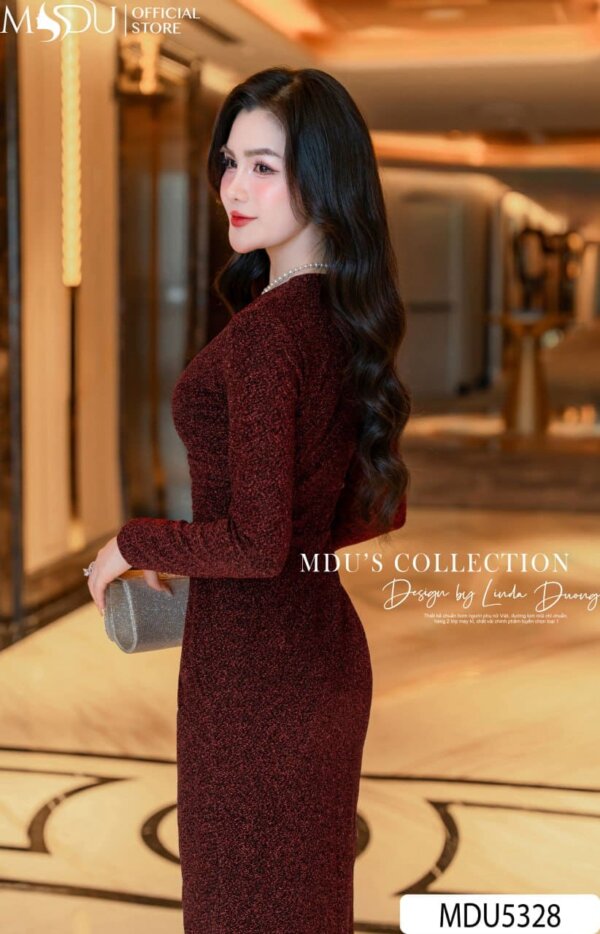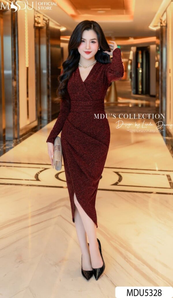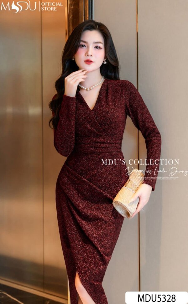MDU5328 embodies the essence of power and poise. Tailored from high-quality glitter crepe, this body-hugging design enhances natural curves while offering complete comfort. The deep wine-red shade radiates sophistication, complemented by a cross-wrapped V-neckline and side draping that sculpts a graceful hourglass silhouette. A front slit adds allure without compromising refinement, creating a perfect balance between sensuality and class. Ideal for evening events, gala dinners, or luxurious celebrations, this piece ensures you shine with quiet confidence and timeless charm.