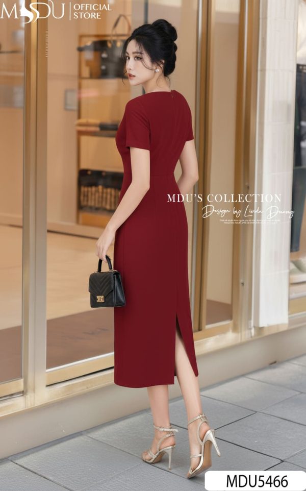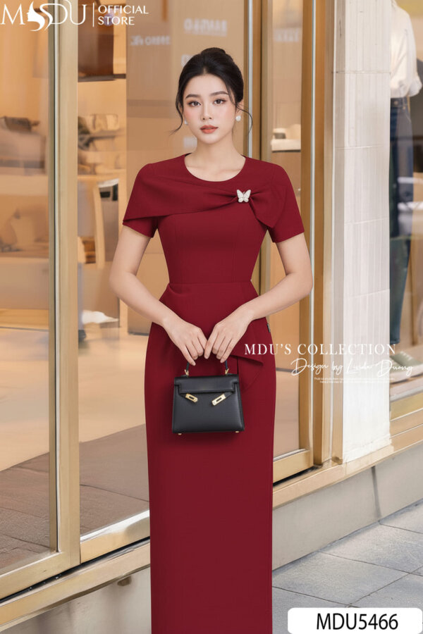 MDU5466 is a vision of elegance and strength, crafted for the woman who commands attention with quiet confidence. The deep crimson hue exudes power and sophistication, while the asymmetrical layered bodice adds architectural precision to the design. A delicate butterfly brooch glimmers softly at the shoulder, balancing femininity with authority. The fitted waist and elongated skirt create a statuesque silhouette, ideal for formal gatherings, special events, or evenings that call for refined grace.