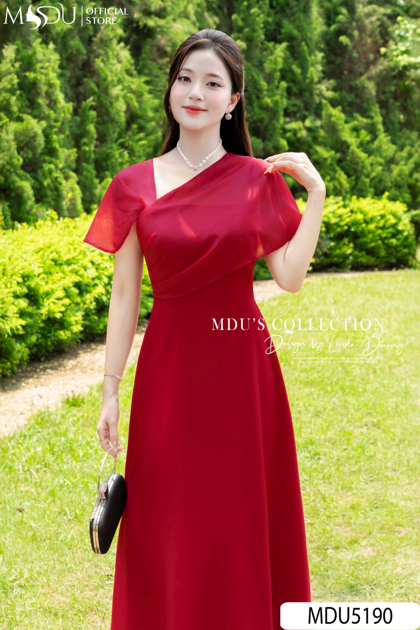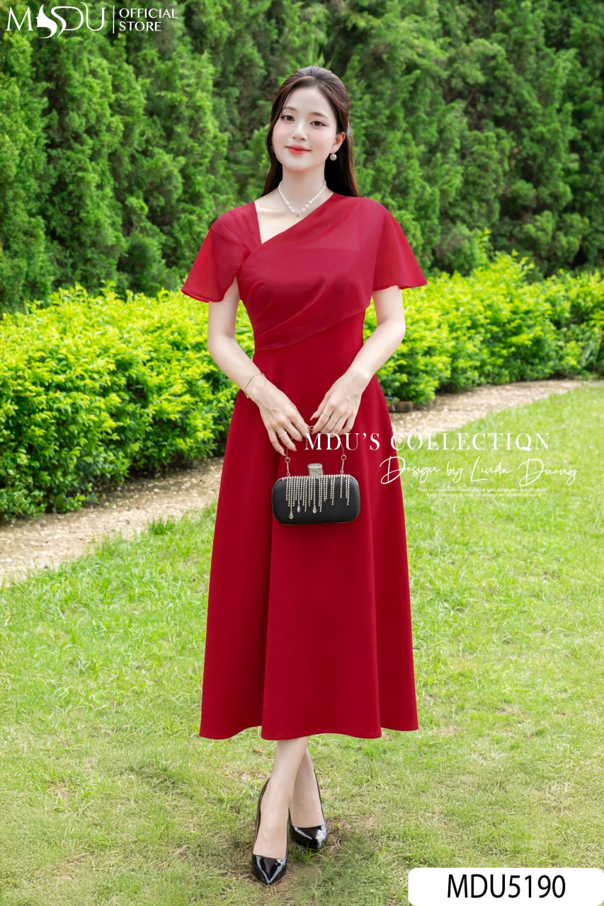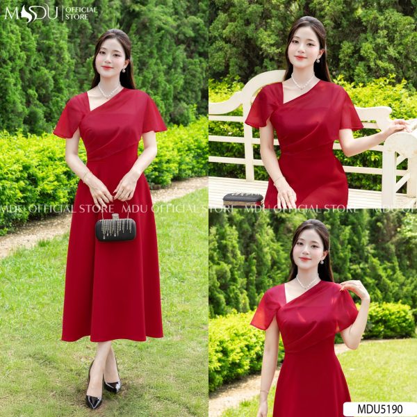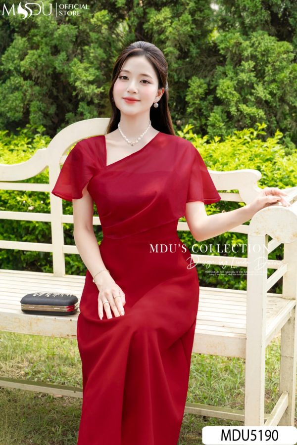 Design Highlights: MDU5190 captures the allure of timeless sophistication through its deep crimson hue and sculpted elegance. The dress features an asymmetric neckline that gently frames the shoulders, balanced by fluttering chiffon sleeves that move with every gesture. The tailored waist subtly enhances the figure, while the A-line skirt flows effortlessly, exuding both poise and femininity. Perfect for evening gatherings, special celebrations, or elegant occasions, this piece embodies the quiet confidence of a woman who knows her strength and her grace.