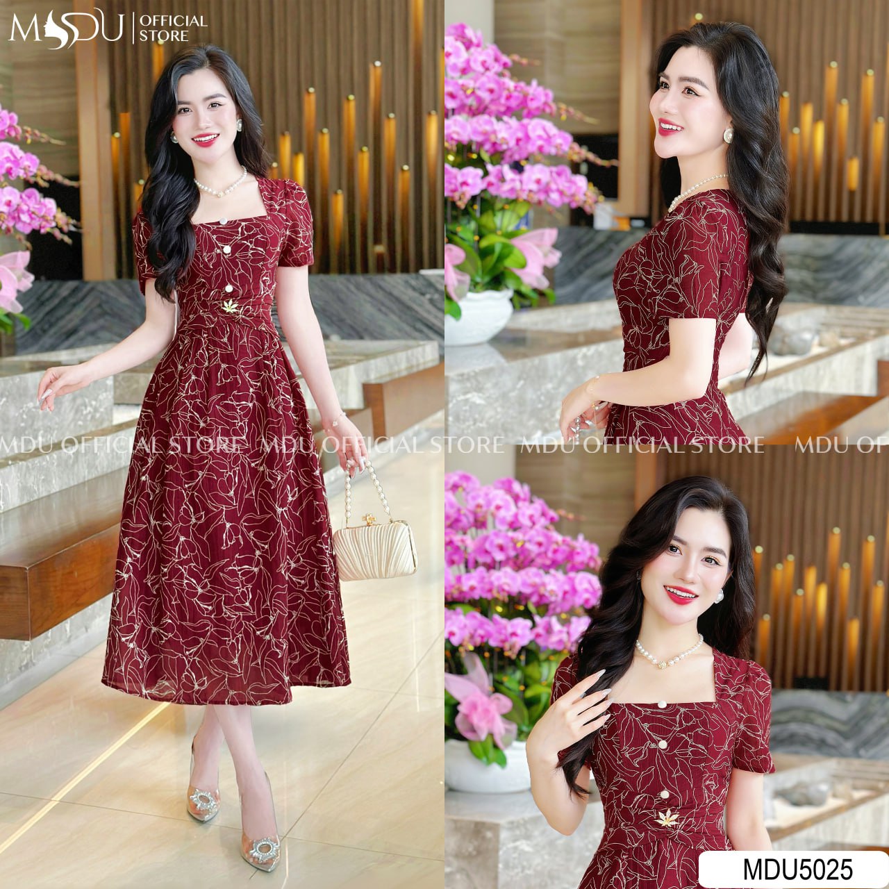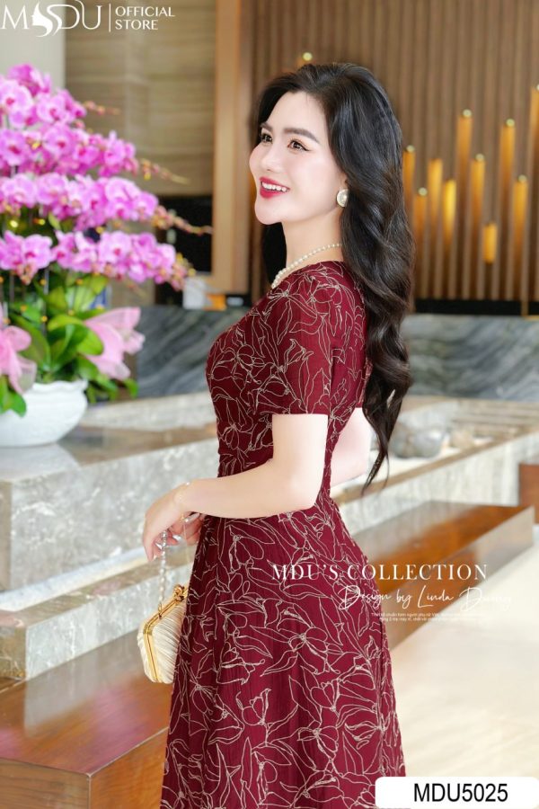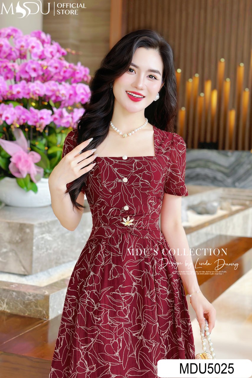 Design Highlights: MDU5025 embodies timeless allure with its deep crimson tone and gold-threaded floral embroidery. The square neckline and softly puffed sleeves bring a touch of refined femininity, while the fitted waistline gracefully highlights the silhouette. The A-line midi skirt flows naturally, creating elegant movement with every step. Decorative buttons along the front and a delicate golden clasp accentuate the design’s sophistication. Ideal for formal gatherings, romantic dinners, or festive occasions, this piece perfectly balances luxury and poise — a true statement of confidence and charm.