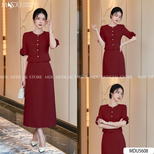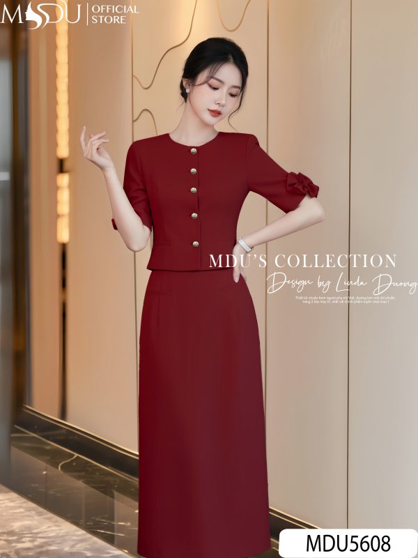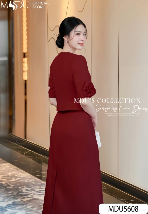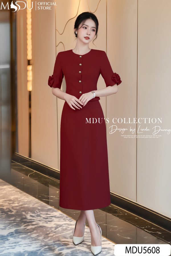This midi dress in deep crimson captures the quiet confidence of modern femininity. Tailored in a streamlined silhouette, it features half sleeves adorned with sculpted fabric flowers that echo sophistication through subtle detail. The front gold-tone button line adds a refined accent while elongating the torso visually, creating an effortlessly graceful proportion. With its modest round neckline and elegant ankle-grazing length, this piece embodies timeless elegance – ideal for executive meetings, formal luncheons, or evening receptions where poise and understated charm are key.