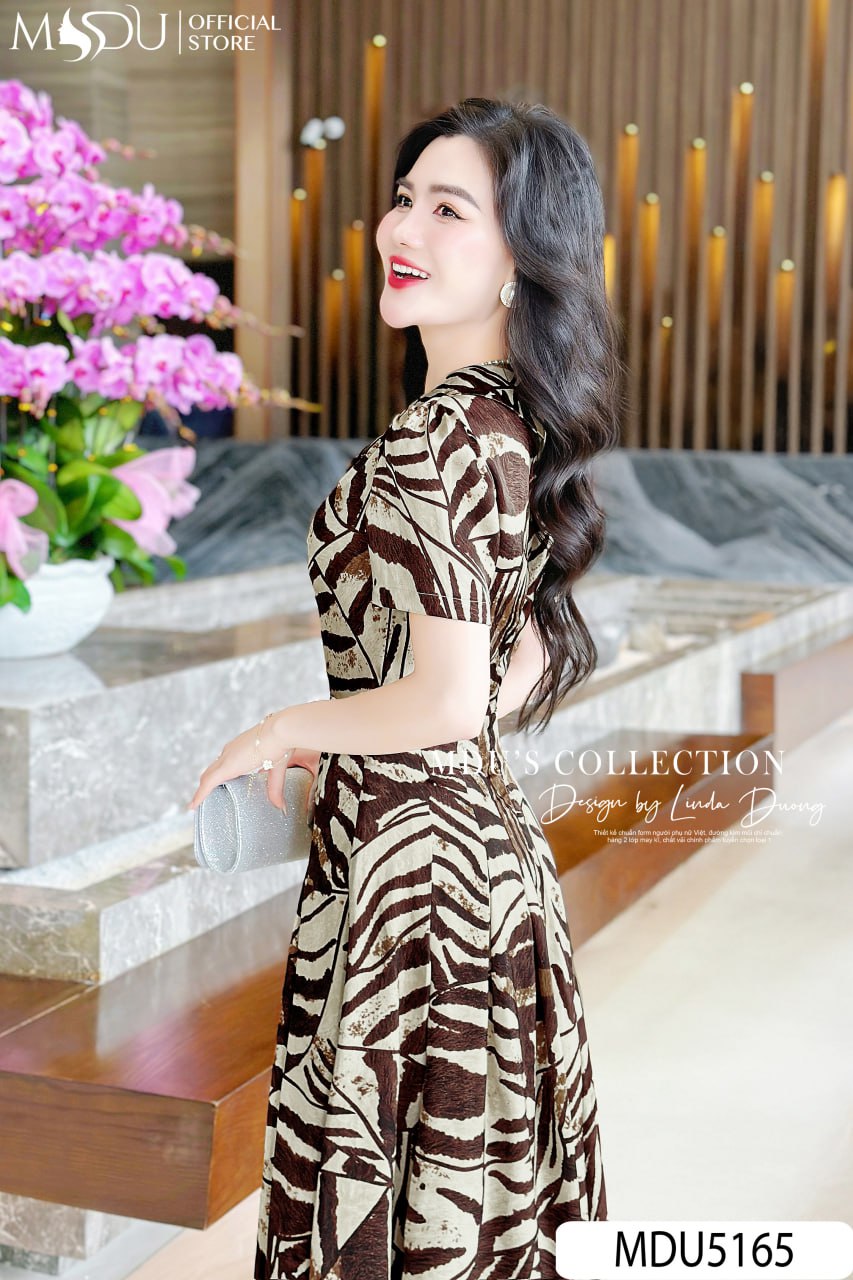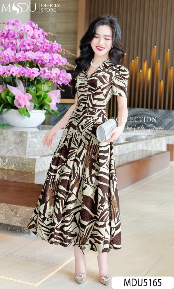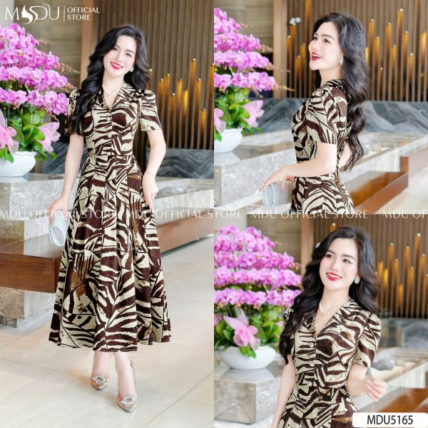 MDU5165 is a chic midi dress that offers a blend of sophistication and modern design. Featuring an earthy floral print in shades of brown and beige, this dress exudes elegance with its feminine silhouette. The wrap-style bodice with a delicately gathered waist enhances the curves while the full skirt flows gracefully, adding volume and movement. The puffed sleeves and the slight V-neckline elevate the dress, making it an ideal option for both casual and semi-formal occasions.
