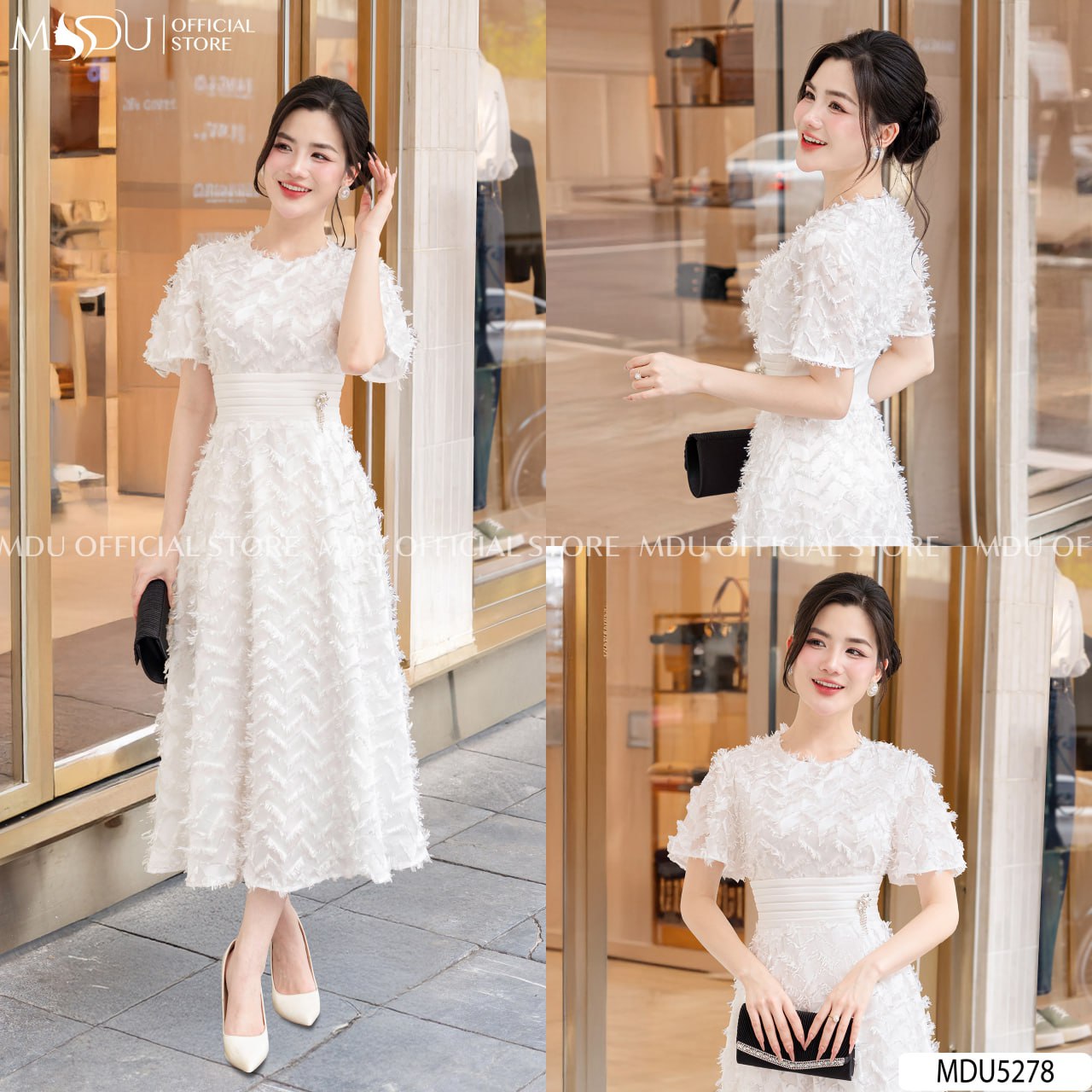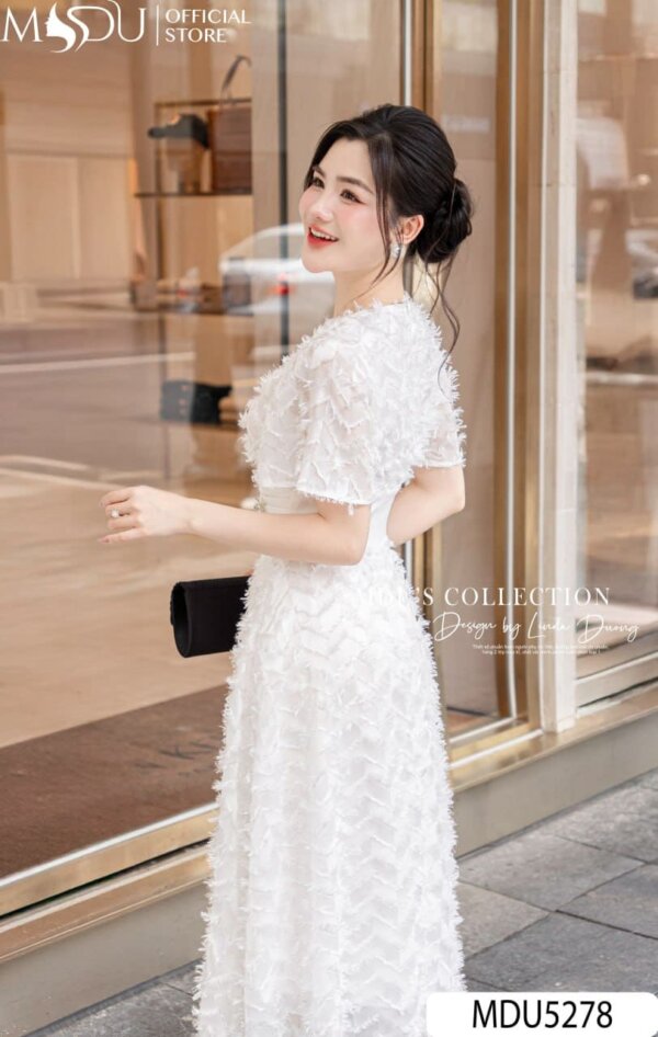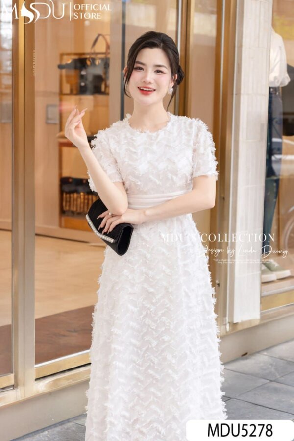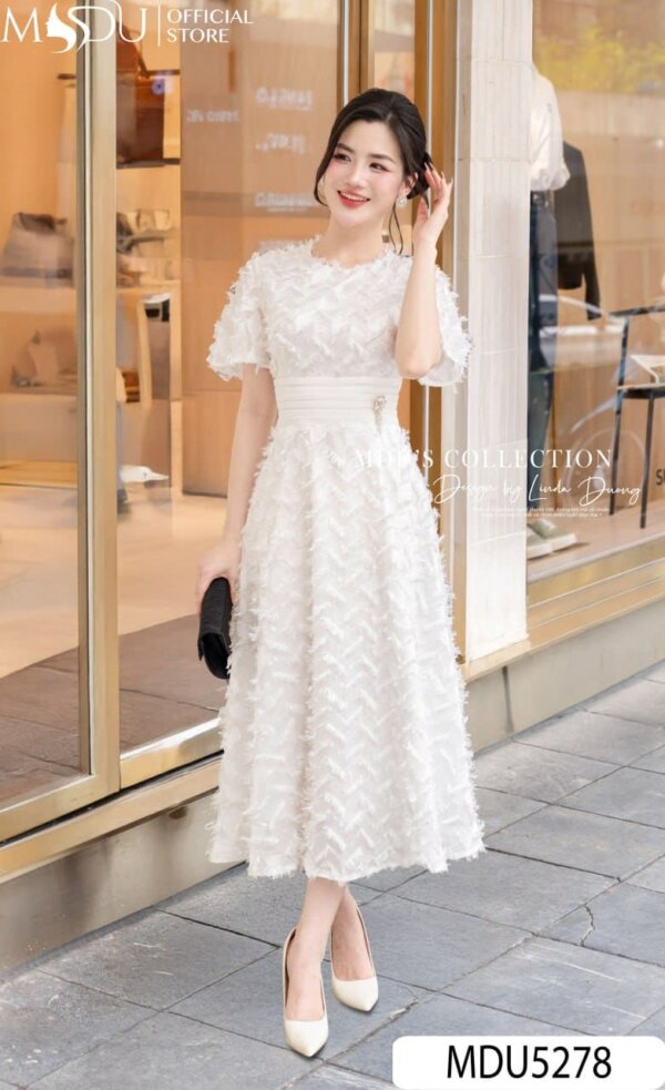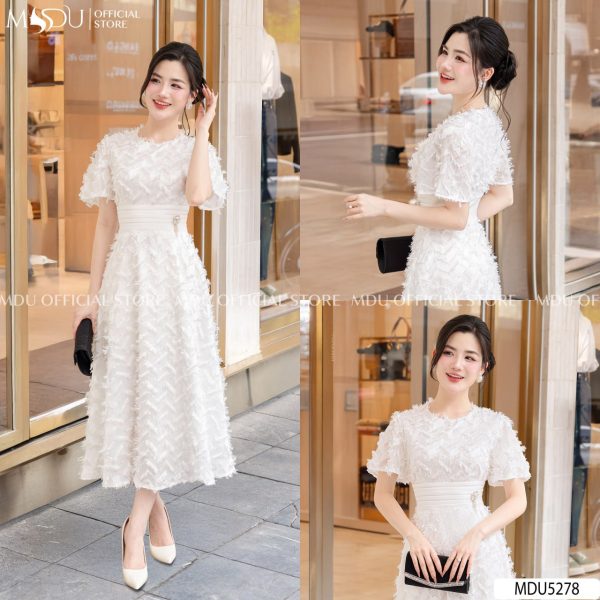 The MDU5278 is a beautifully crafted dress that effortlessly blends romance and sophistication. With its intricate floral lace texture, this dress exudes a soft, ethereal charm that’s perfect for any elegant occasion. The puffed sleeves and delicate waist belt create a flattering, feminine silhouette, while the midi-length skirt adds a touch of grace and movement. The floral details are carefully designed to create a three-dimensional effect that adds visual intrigue and sophistication. This dress is perfect for garden parties, elegant evening gatherings, or any occasion where you want to make a lasting impression.
