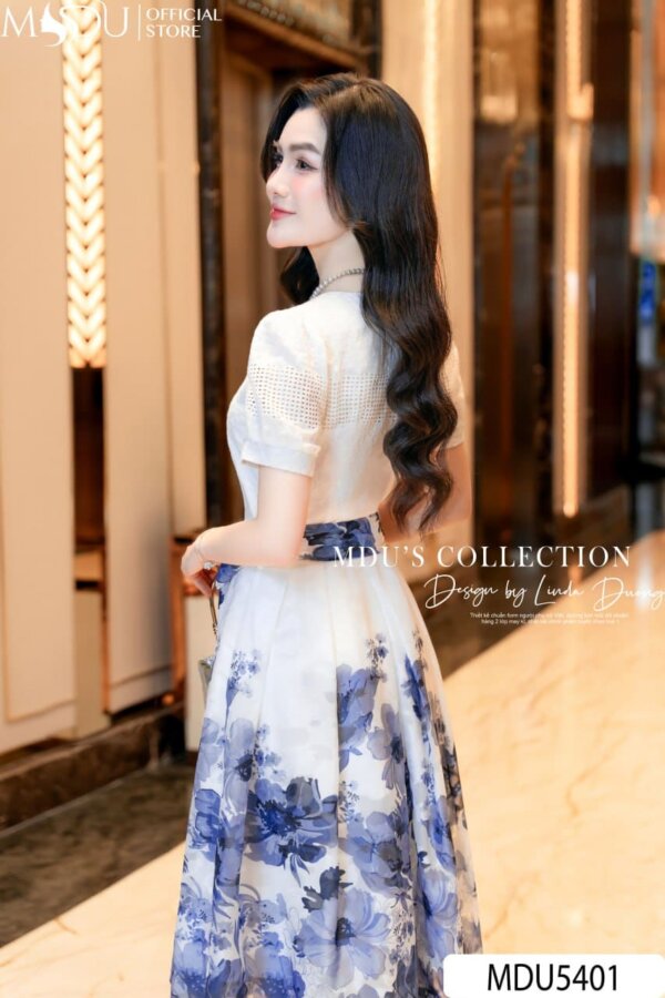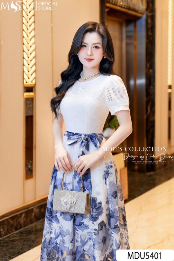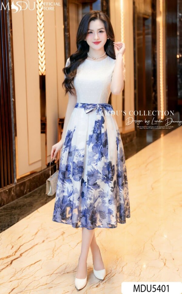 MDU5401 celebrates feminine grace through the delicate beauty of floral artistry. The dress features a pristine ivory bodice with a subtle texture that gently contours the upper frame, while the A-line skirt blooms into a cascade of blue watercolor florals. A tonal bow cinches the waist, creating a refined silhouette that balances modern structure with timeless romance. Crafted from an airy organza blend, this piece moves with effortless fluidity — perfect for garden parties, daytime events, or elegant luncheons. Each detail is designed to express serenity, poise, and sophistication.
