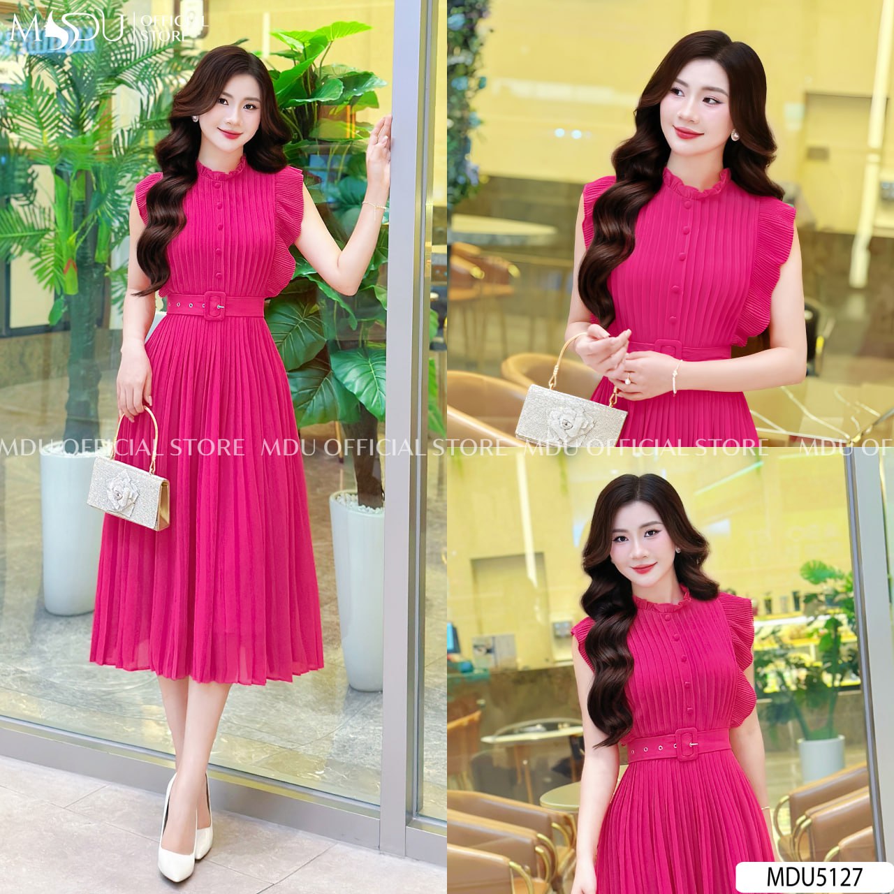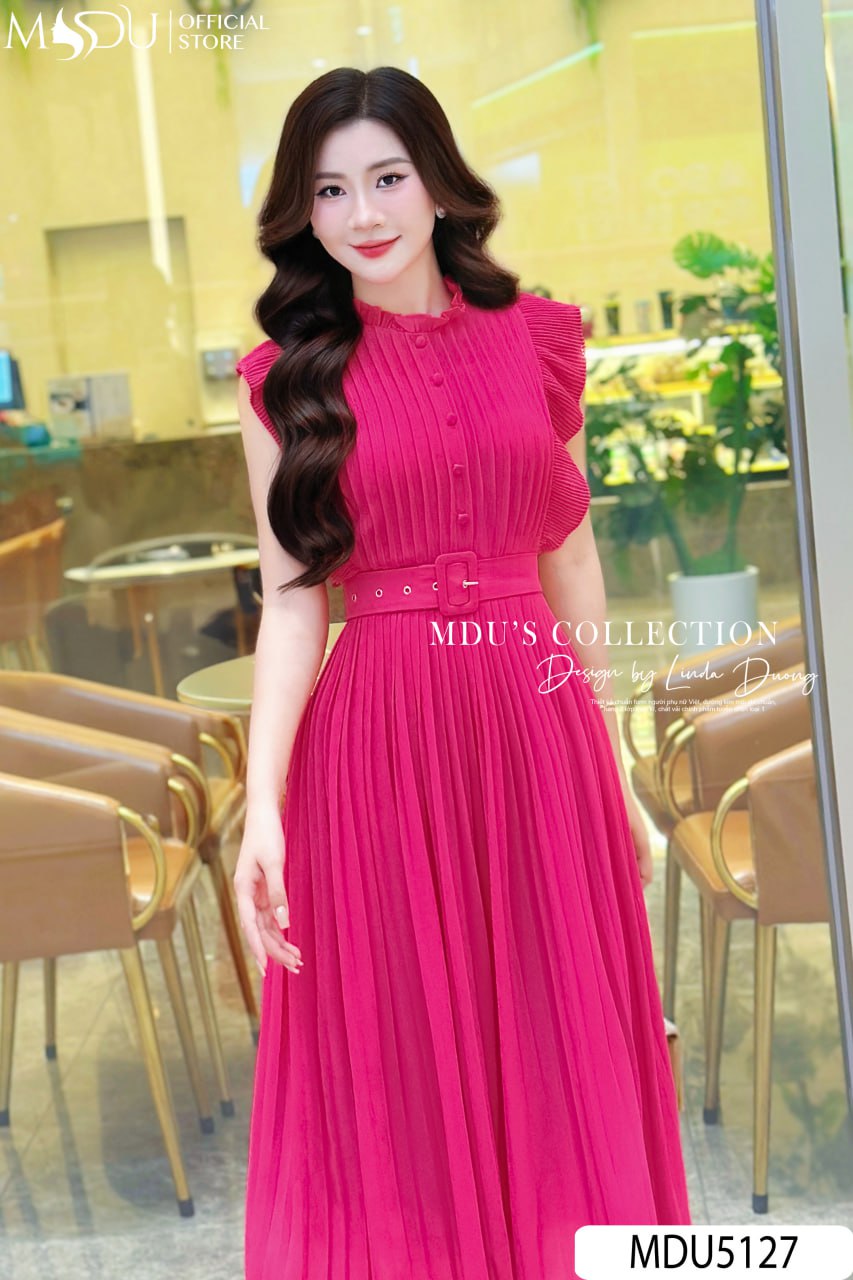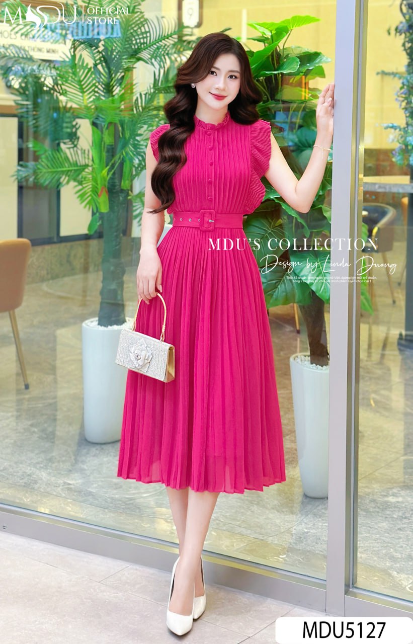 Design Highlights: MDU5127 is a stunning expression of feminine refinement. Crafted from pleated chiffon, the dress exudes effortless grace with its vibrant fuchsia hue — bold yet exquisitely elegant. The high ruffled neckline and button-down bodice create a sense of timeless sophistication, while the belted waist highlights the natural curves, enhancing a beautifully elongated silhouette. The softly flared midi skirt moves fluidly with every step, making this piece ideal for both formal occasions and chic daytime gatherings. Designed for the modern woman who embraces confidence, charm, and understated luxury.
