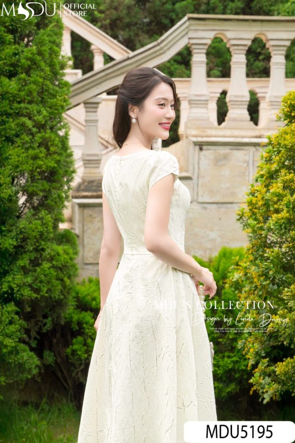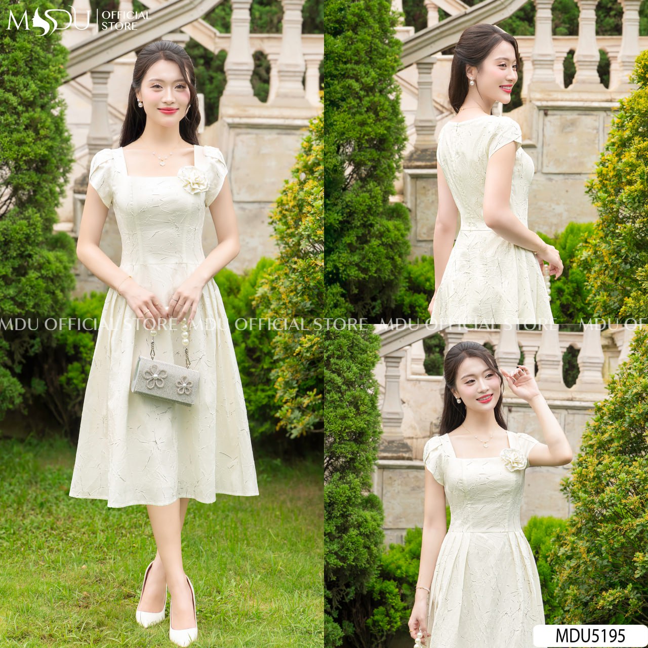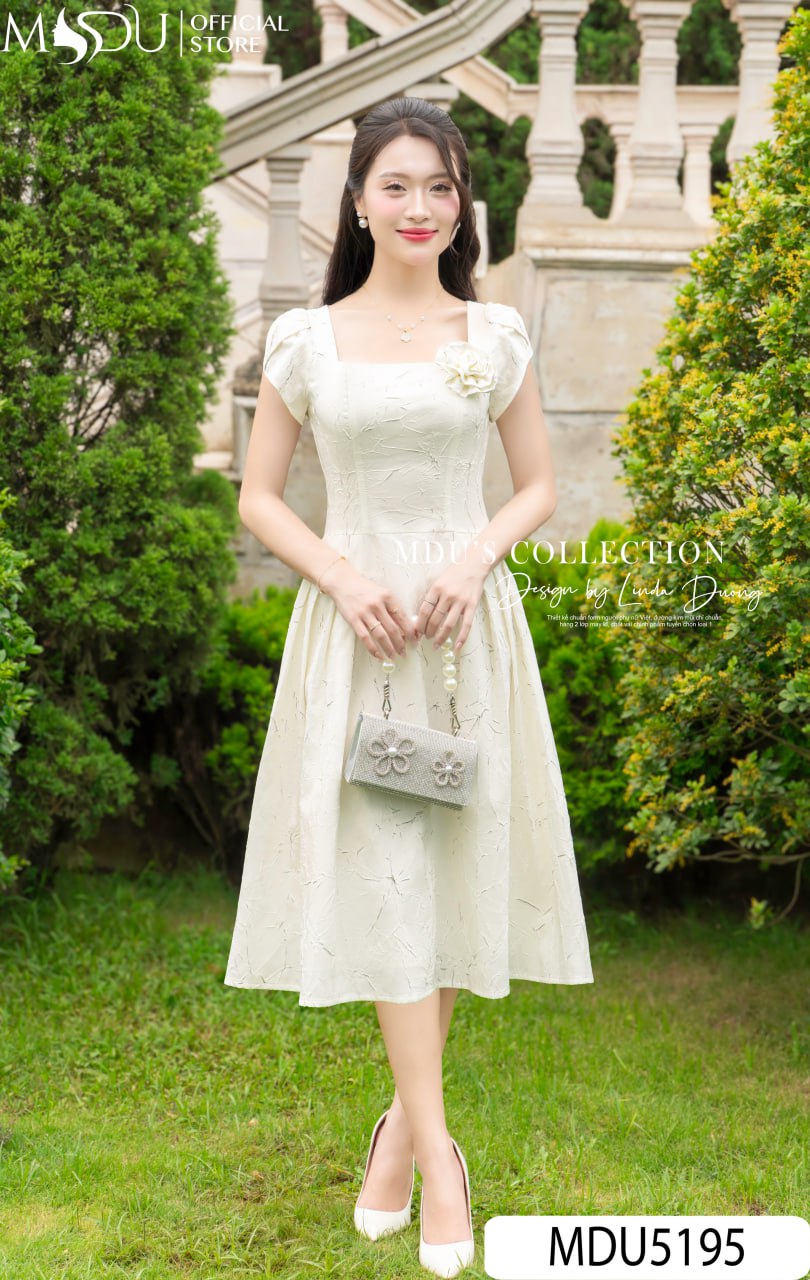 Design Highlights: MDU5195 embodies the purity of understated elegance through a timeless ivory palette and meticulously crafted silhouette. The embossed jacquard fabric brings subtle depth and sophistication, while the fitted bodice with a square neckline and puff sleeves creates a beautifully feminine balance. A delicate floral applique at the bust adds a touch of charm, harmonizing with the flared midi skirt that moves gracefully with every step. Perfect for garden parties, elegant brunches, or semi-formal occasions — this dress speaks the language of quiet luxury and modern poise.
