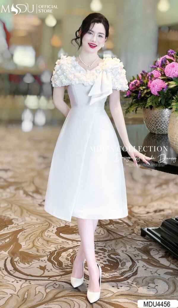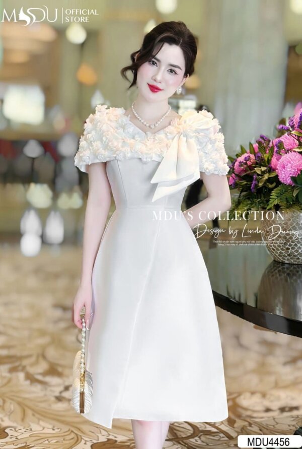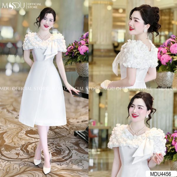 MDU4456 embodies the epitome of ethereal elegance through its refined ivory tone and masterful detailing. The dress features a flattering A-line silhouette that flows gracefully, while the upper bodice is adorned with hand-placed 3D floral embellishments — a romantic statement of craftsmanship and poise. The gentle off-shoulder neckline is finished with a satin bow, lending a whisper of sophistication and femininity. Its subtle sheen and pristine tailoring make this dress the ideal choice for afternoon receptions, engagement parties, or elegant gatherings where charm meets timeless purity.