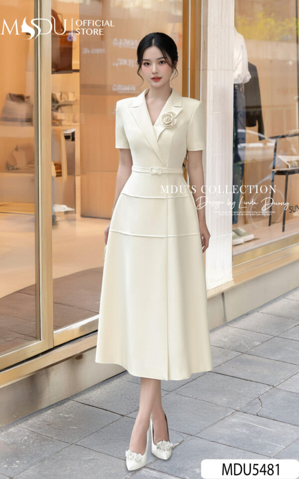 MDU5481 captures the essence of timeless femininity in an ivory tone that radiates quiet luxury. The tailored blazer-style bodice with notched lapels defines the silhouette, while the cinched waist and flowing midi skirt create a harmonious balance between structure and softness. A handcrafted floral embellishment at the chest adds a romantic touch, symbolizing understated sophistication. Perfect for high-end meetings, afternoon gatherings, or formal events where elegance speaks effortlessly.