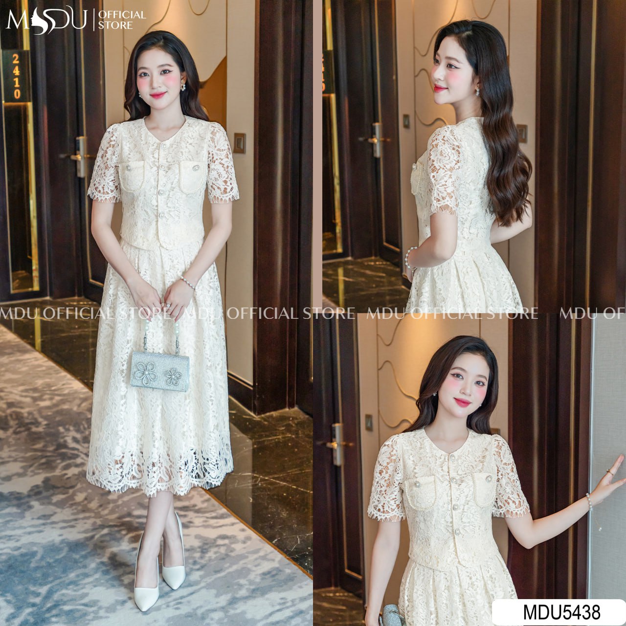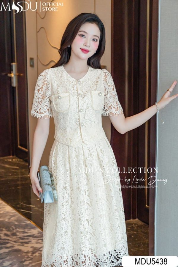 MDU5438 is a tribute to timeless femininity, designed for the woman who embodies quiet confidence. The midi dress features intricate floral lace that captures light beautifully, enhanced by a structured bodice with front pockets and pearl-button detailing. The softly puffed short sleeves add a romantic dimension, while the flared hemline brings gentle movement with every step. Exuding an air of sophistication and grace, this piece is ideal for formal luncheons, elegant gatherings, or special daytime occasions that call for poised beauty.