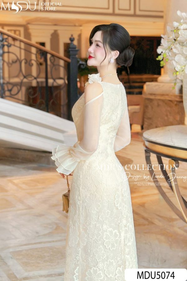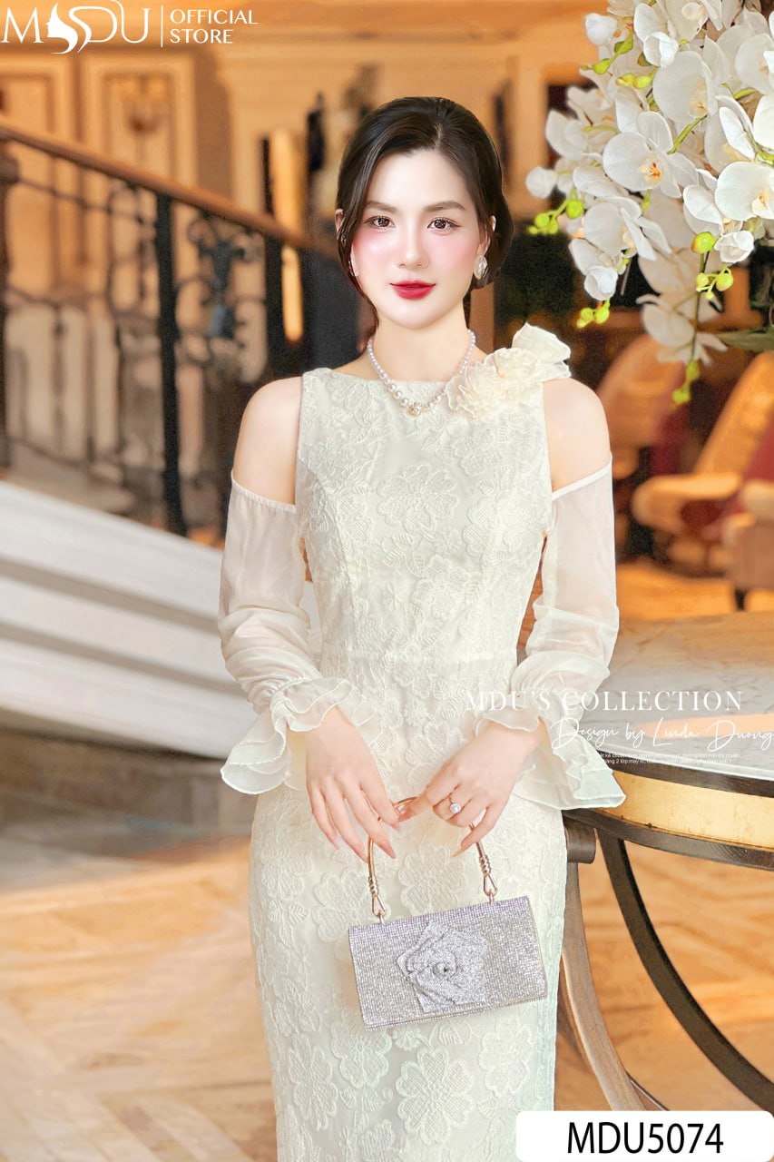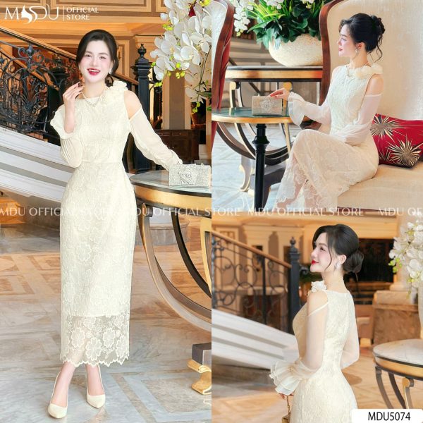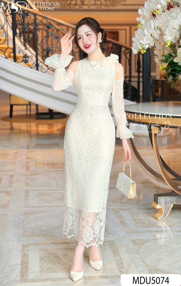 A refined ivory lace dress that embodies timeless femininity. With sheer chiffon sleeves, floral details, and a slim-cut silhouette, MDU5074 exudes pure sophistication for formal or semi-formal occasions.