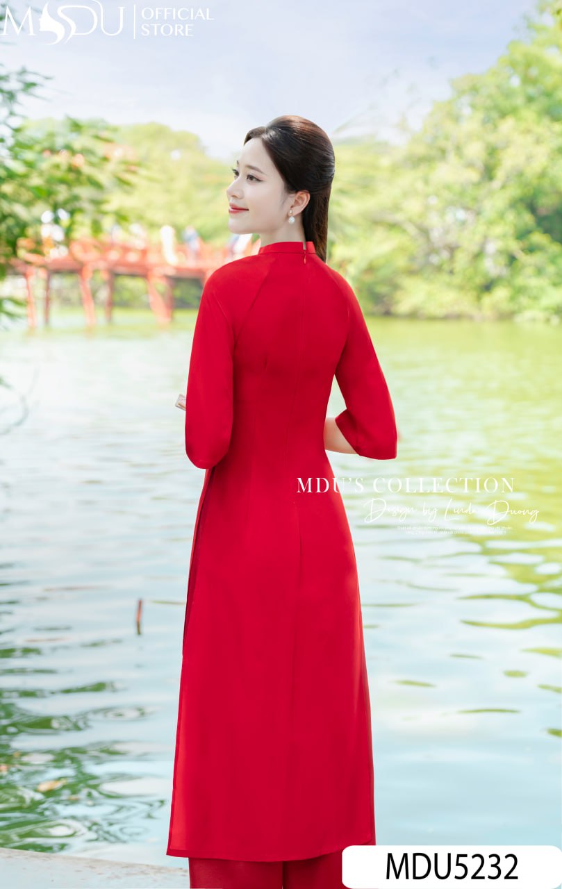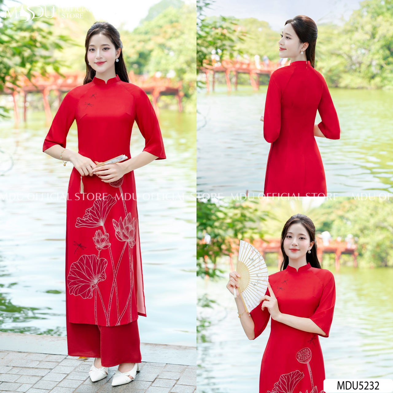 Design Highlights: MDU5232 is a stunning piece inspired by traditional Vietnamese Ao Dai designs, featuring a modern twist with its vivid red color and elegant lotus flower embroidery. The dress includes a simple yet graceful top with a high neckline, complemented by relaxed, flowing trousers that enhance the silhouette. The lotus motif, embroidered along the length of the dress, represents purity and grace, making this outfit an ideal choice for cultural gatherings, festive occasions, or elegant evening events.