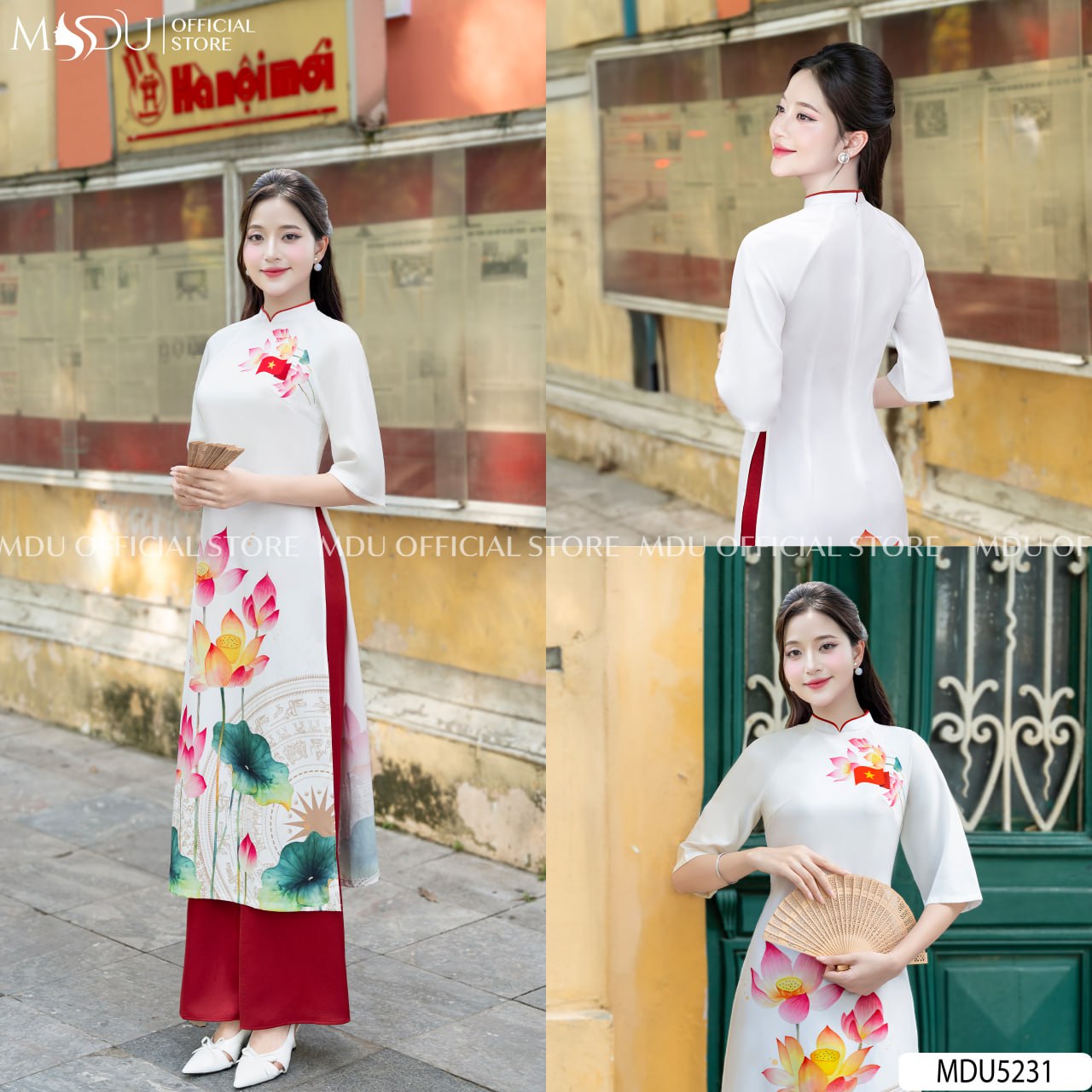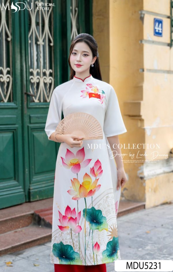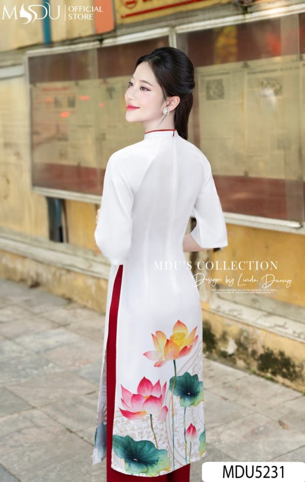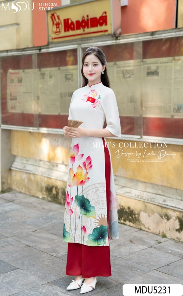 Design Highlights: MDU5231 pays tribute to the timeless beauty of Vietnamese culture through the gentle charm of the áo dài. Rendered in a pure ivory-white tone, the design features exquisite lotus flower motifs — a symbol of purity, resilience, and feminine strength. The lotus blooms softly against the backdrop of the bronze Đông Sơn drum pattern, representing heritage and national pride. The red silk trousers harmonize perfectly, adding a touch of vibrancy that enhances the symbolism of vitality and grace. With its modest high collar and three-quarter sleeves, this piece captures both serenity and confidence, making it ideal for ceremonies, festive occasions, or cultural celebrations.