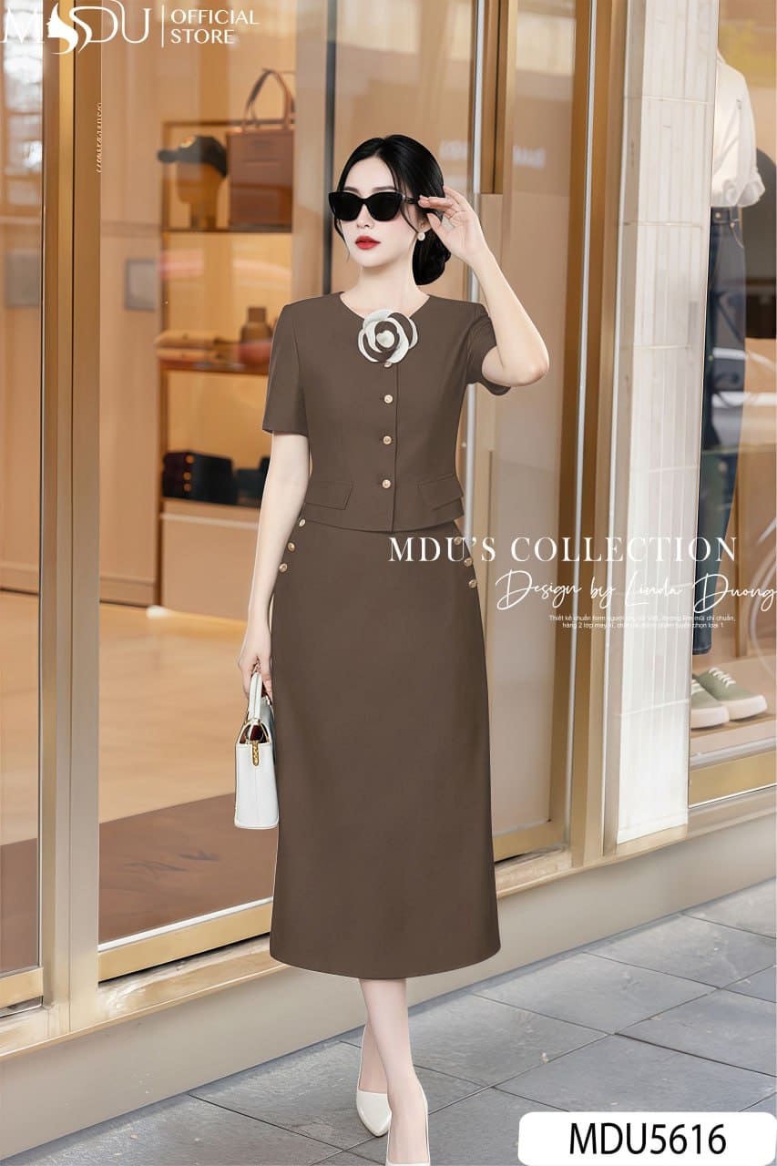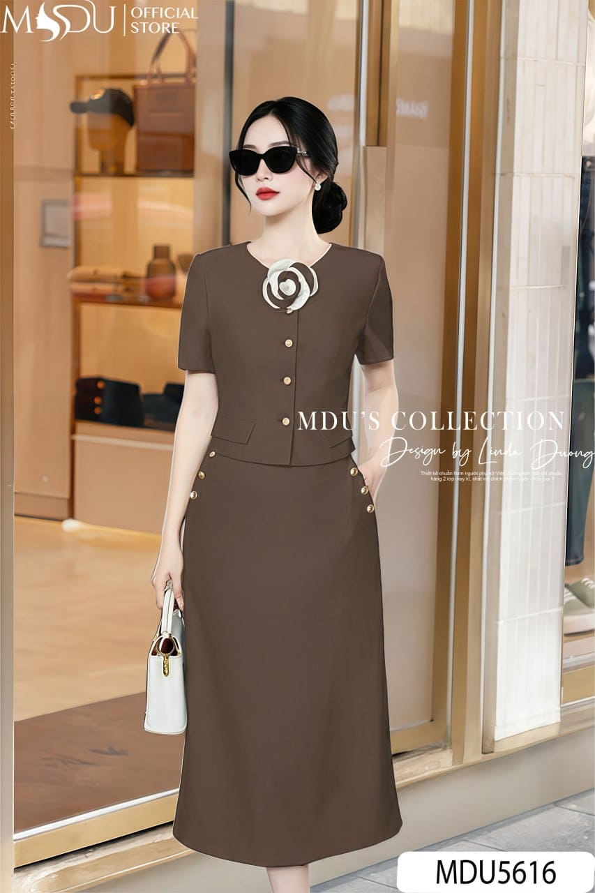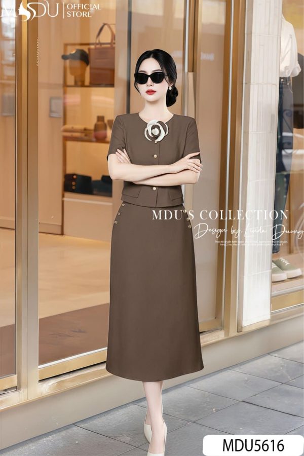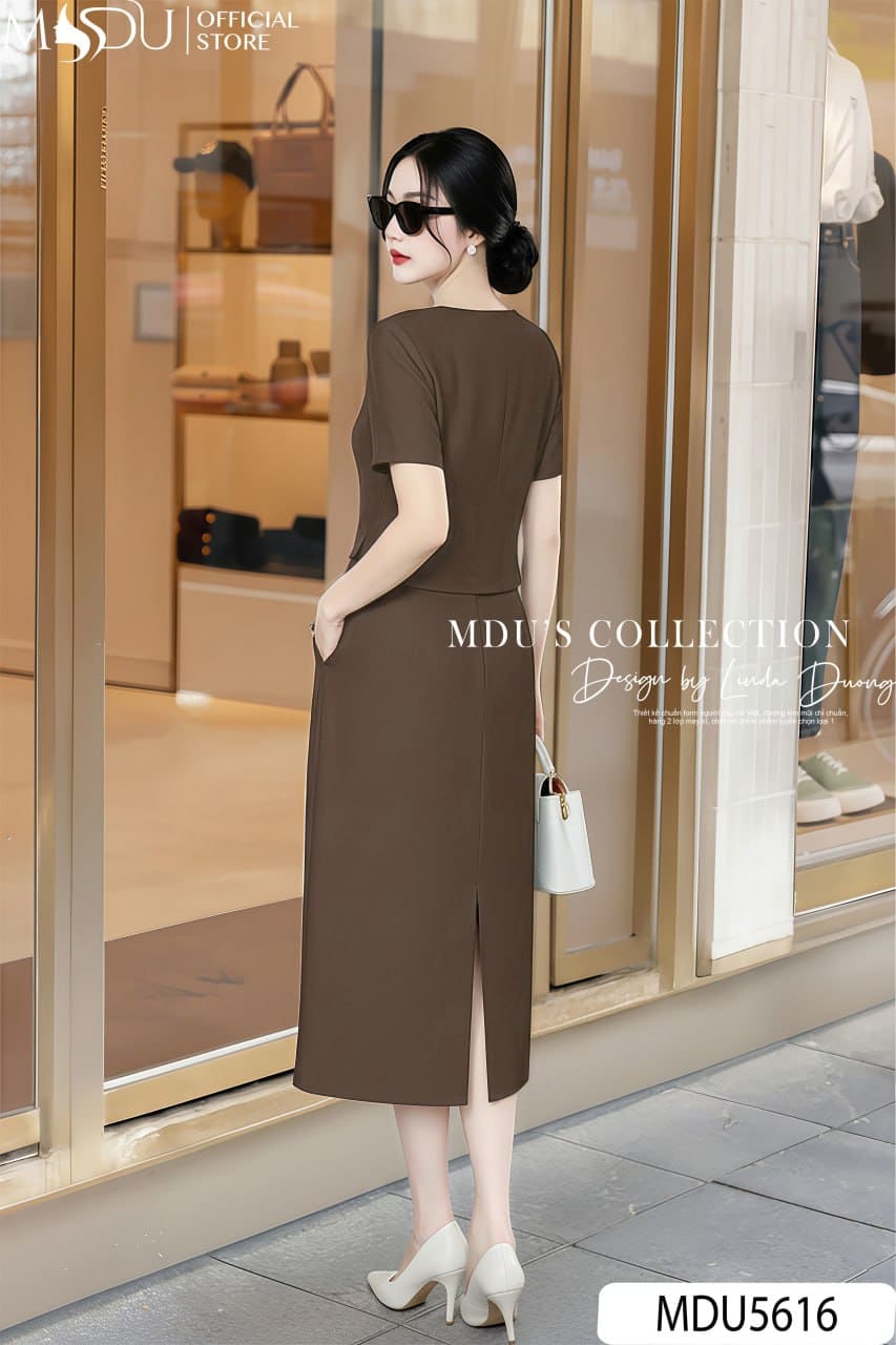 Design Highlights: This midi dress in deep brown exudes a timeless elegance, with its tailored fit and delicate details. The buttoned accents along the waistline and side pockets offer a sophisticated yet understated touch. The simple, structured top contrasts beautifully with the flowing skirt that gently grazes the knees, enhancing the dress’s flattering silhouette. Ideal for both formal and semi-formal events, this dress is versatile and chic, perfect for meetings, luncheons, or evening gatherings.
