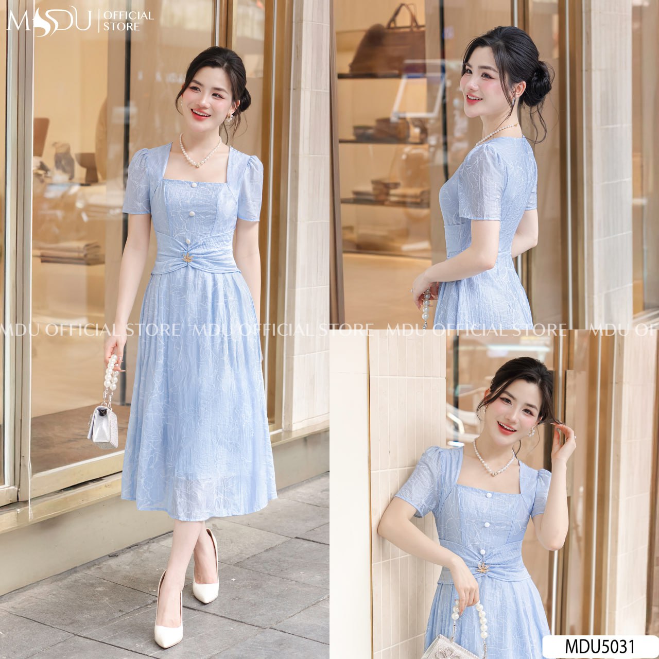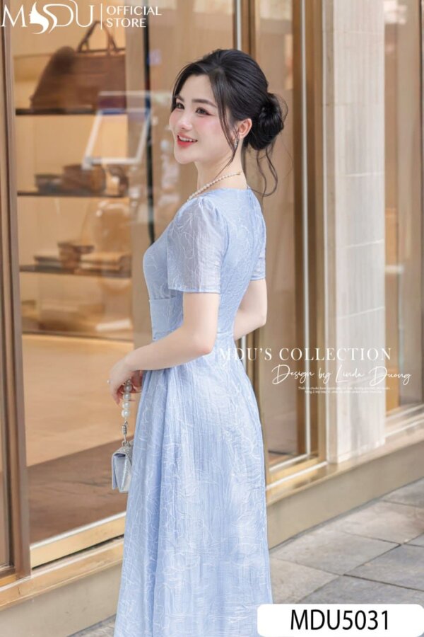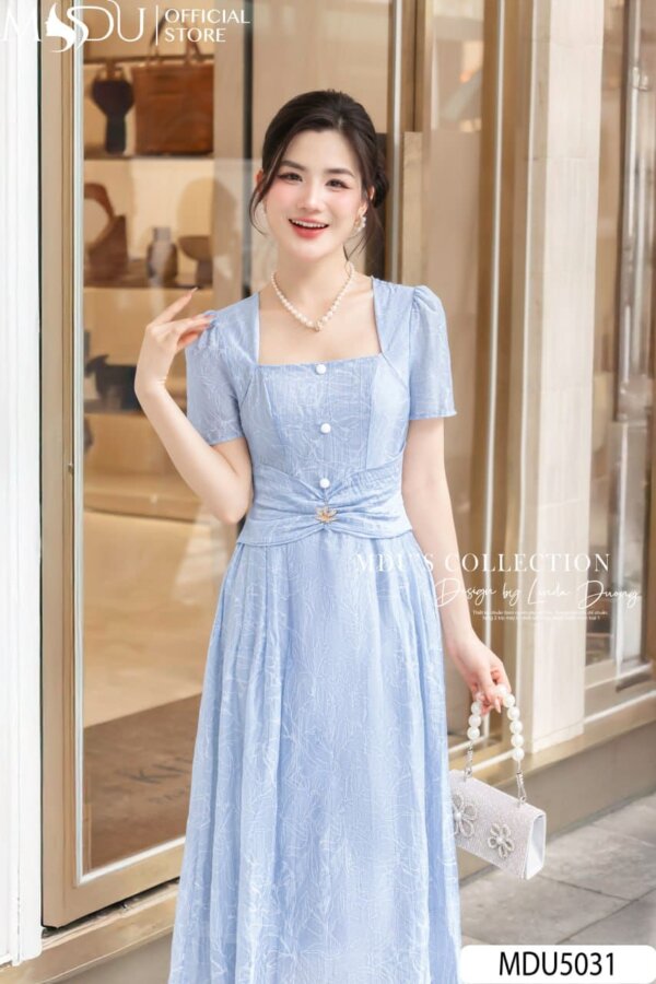 The MDU5031 dress is a delightful midi-length piece that features a beautiful light blue shade. The dress is adorned with a delicate floral detail at the shoulder, adding a feminine touch to its sophisticated design. With a flattering square neckline, puffed short sleeves, and a flattering waistline, this dress offers both elegance and comfort. The skirt flares gracefully, creating a timeless silhouette that is perfect for formal events or chic outings.
