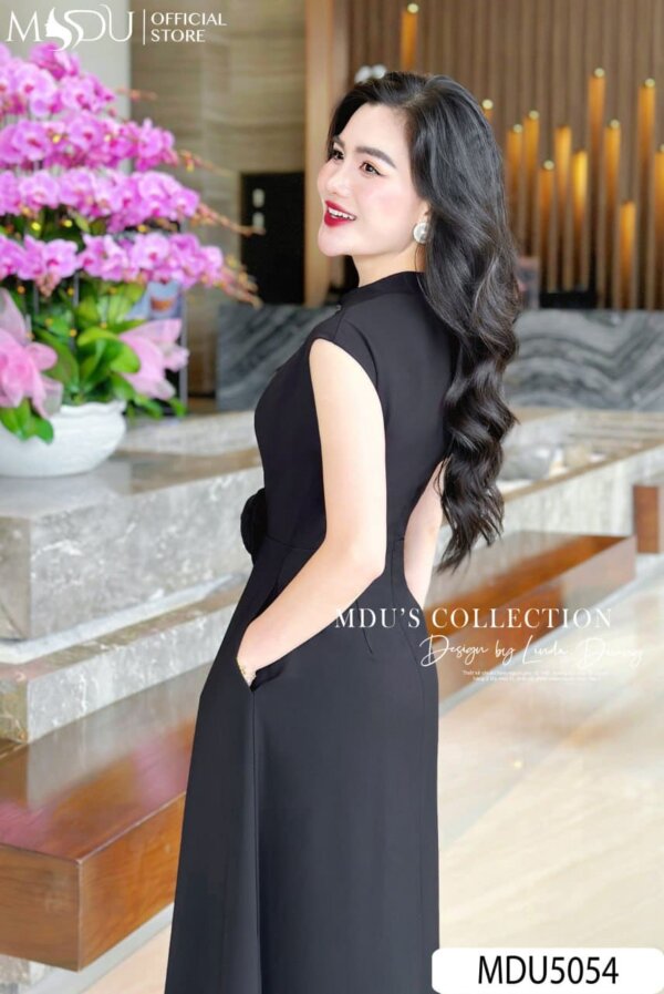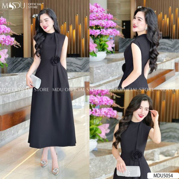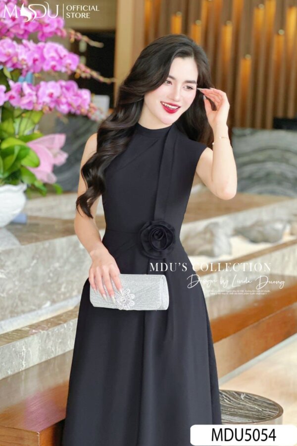 MDU5054 – ELEGANT BLACK MIDI DRESS WITH FLORAL DETAIL