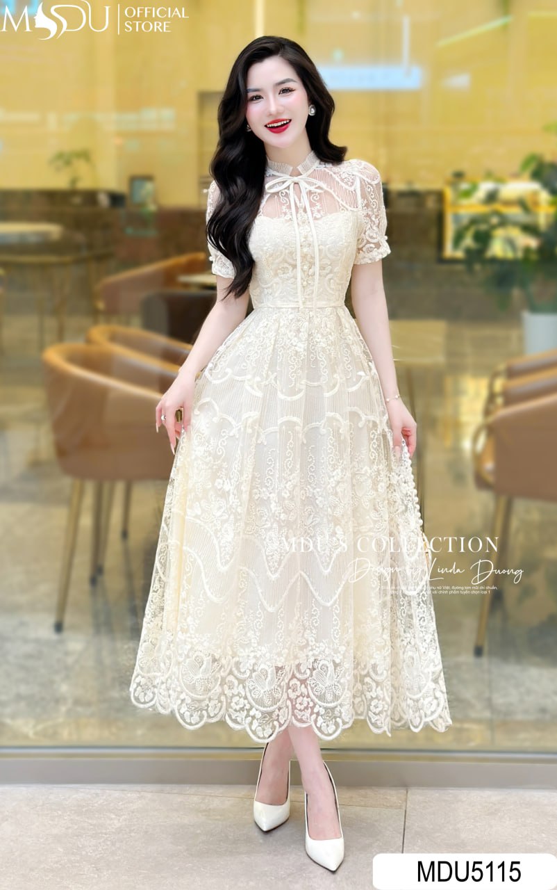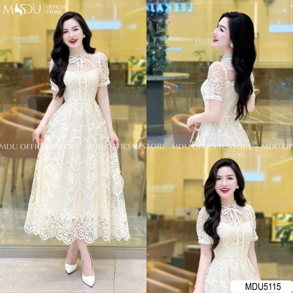 Design Highlights: This stunning midi dress in soft ivory is an epitome of elegance. The intricate floral lace design enhances the feminine silhouette, while the sheer lace details give a romantic and ethereal look. Featuring a delicate bow tie at the neckline and a flattering A-line shape, the dress flows gracefully, making it perfect for both formal and semi-formal occasions. The soft lace overlay adds sophistication, while the fitted bodice ensures a refined and flattering fit.