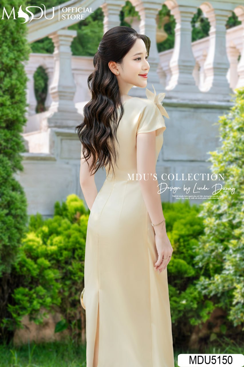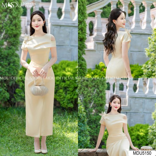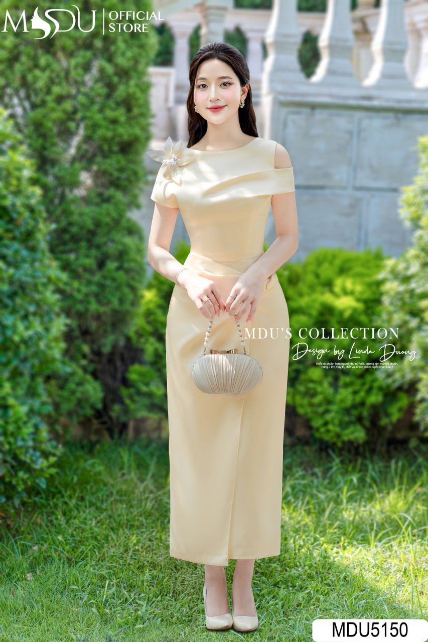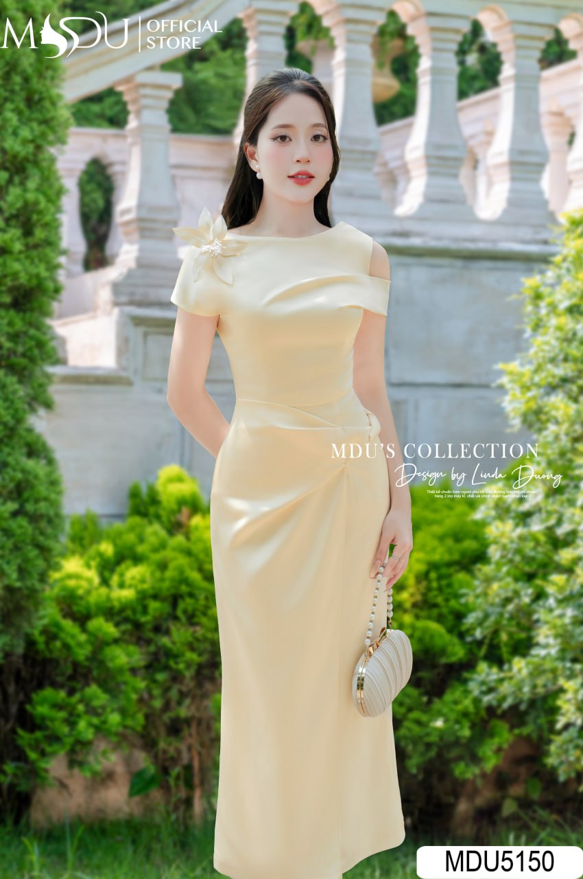 Embrace elegance with MDU5150. The soft yellow satin midi dress features an off-shoulder design with a crystal flower embellishment, perfect for refined evening events.