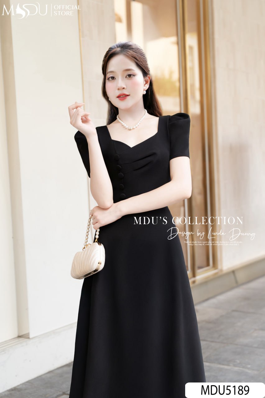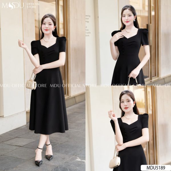 MDU5189 is a black midi dress with soft puffed sleeves and a refined buttoned front. Its A-line cut and timeless design make it perfect for both formal and casual events.