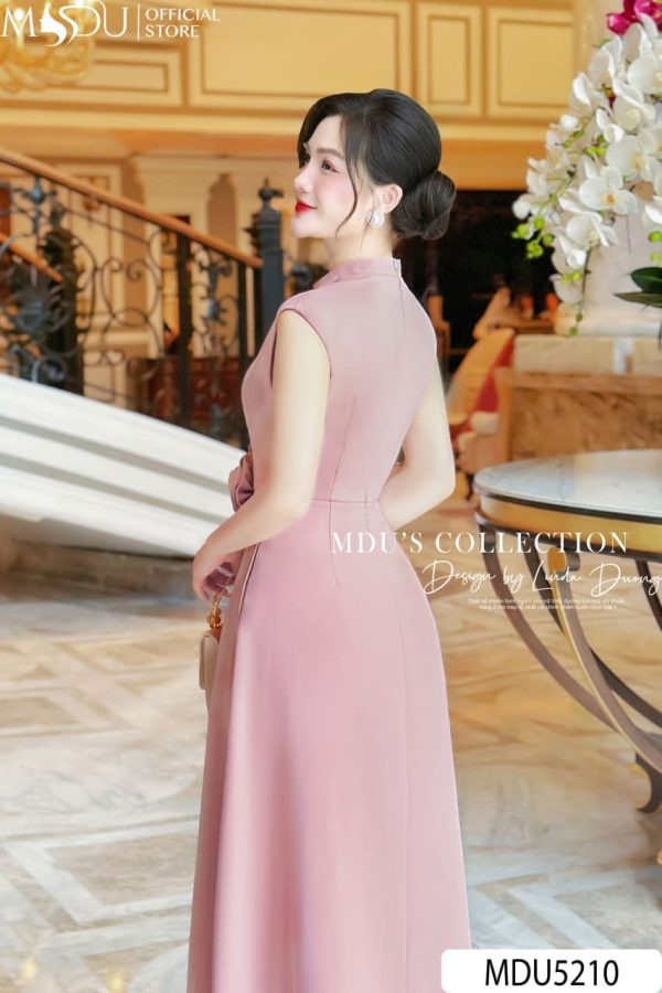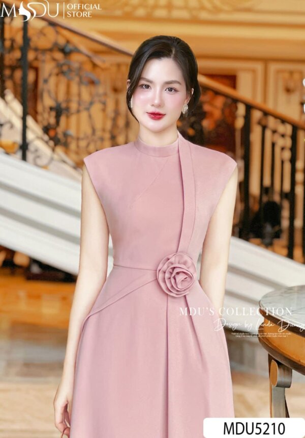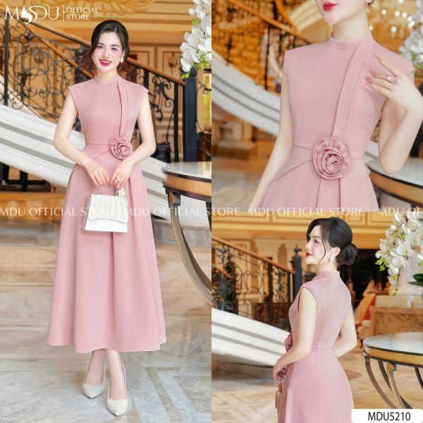 This elegant pink midi dress is a beautiful blend of modern style and feminine charm. The dress features a sleek, form-fitting bodice with a high neckline, giving it a sophisticated and polished look. The flowing skirt gracefully falls to the mid-calf, enhancing the flattering A-line silhouette. A delicate floral accent on the shoulder adds a romantic and whimsical touch. Perfect for formal gatherings, weddings, or cocktail parties, this dress is both refined and versatile.
