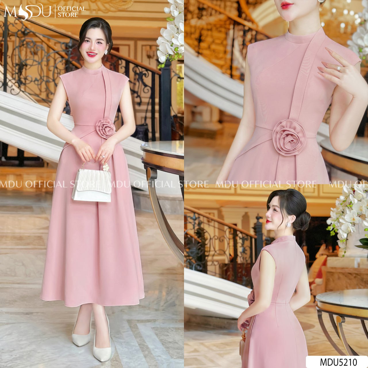 MDU5210 – SOPHISTICATED PINK MIDI DRESS WITH FLORAL DETAIL