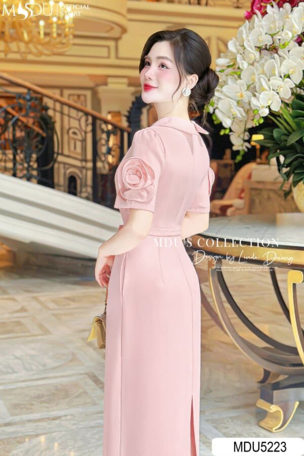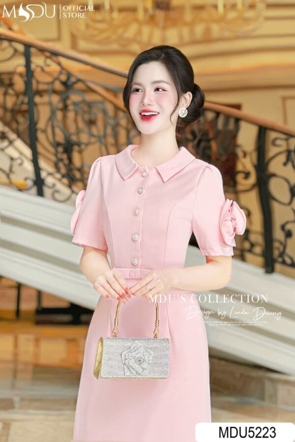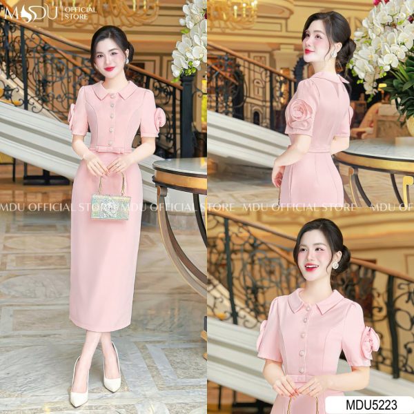 MDU5223 is an elegant pink button-down midi dress with puffed sleeves, a classic collar, and a flattering A-line silhouette. Ideal for daytime events and formal gatherings.