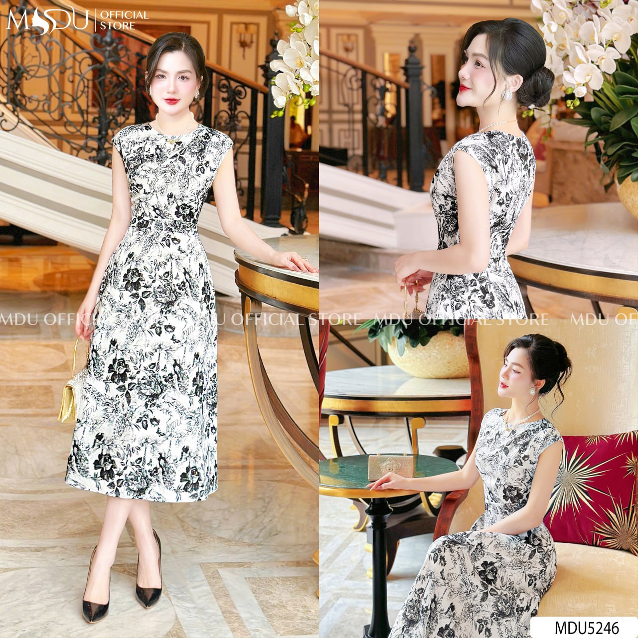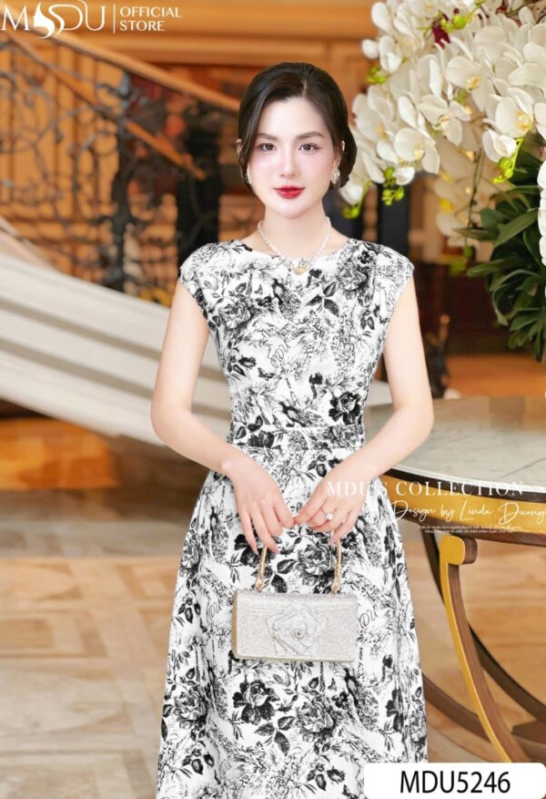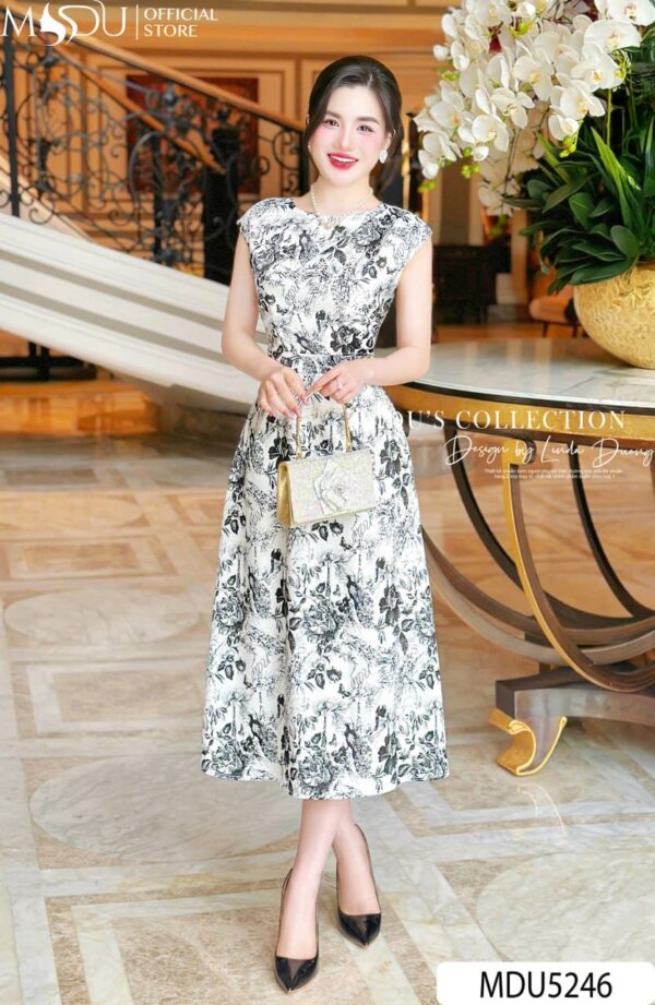 MDU5246 – ELEGANT BLACK AND WHITE FLORAL MIDI DRESS