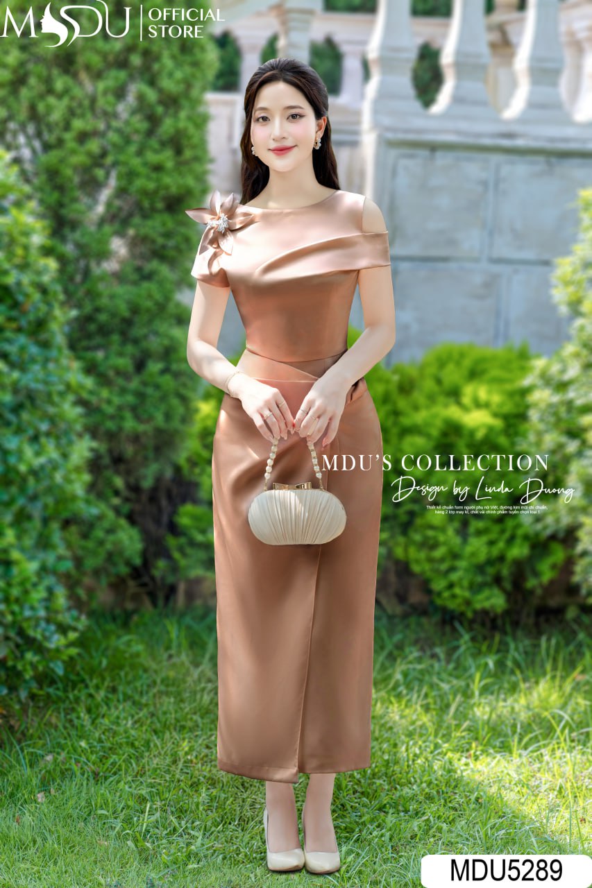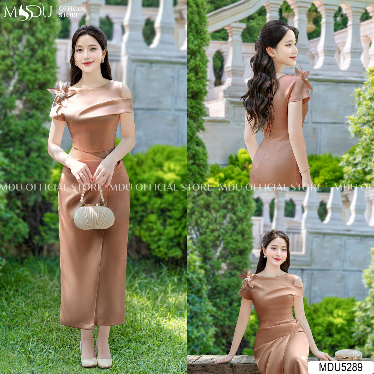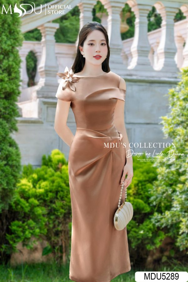 Design Highlights: This sophisticated midi dress in a rich, warm caramel tone exudes refined elegance. The off-shoulder design adds a graceful, feminine touch, while the delicate fabric flower accent on the side adds a subtle hint of charm. The fitted waistline and sleek satin fabric enhance the figure, while the A-line silhouette flows gracefully, providing both comfort and style. Perfect for formal occasions, evening parties, or high-end gatherings, this dress offers timeless beauty and sophistication.