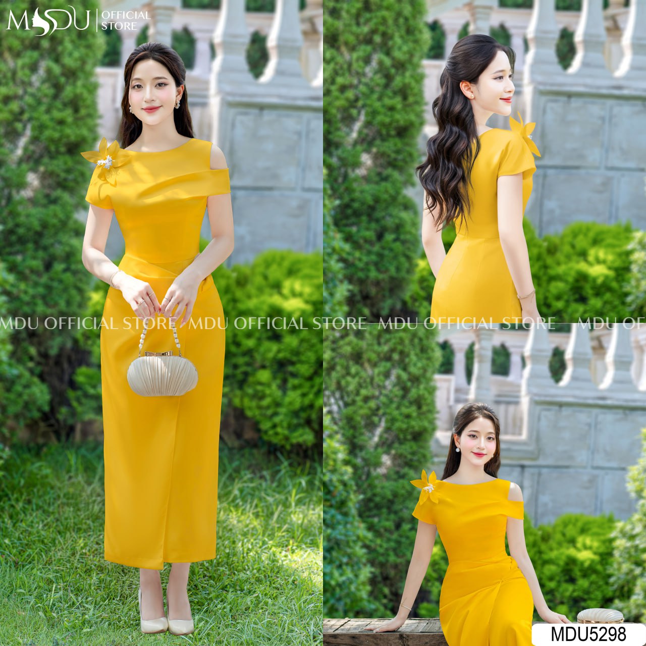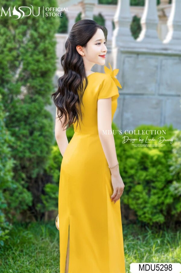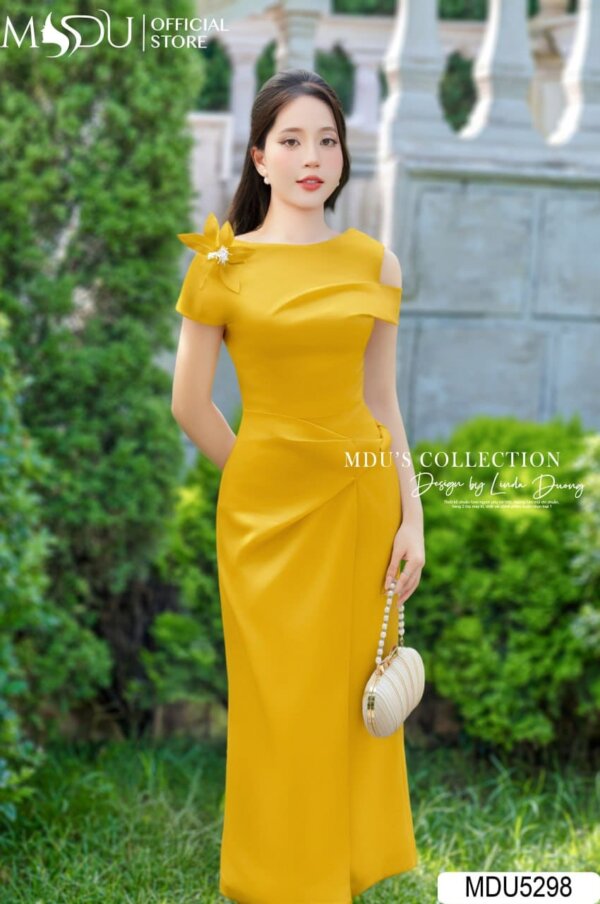 The MDU5298 dress is a timeless creation that combines sophistication with a touch of playfulness. The bold yellow hue is complemented by an elegant off-shoulder design, while the stunning floral embellishment on the shoulder adds an extra flair of charm. The sleek A-line silhouette accentuates feminine curves, providing a flattering fit. Ideal for garden parties, formal gatherings, or evening events, this dress ensures that you stand out with grace.