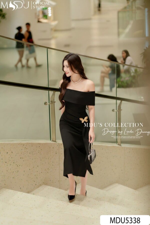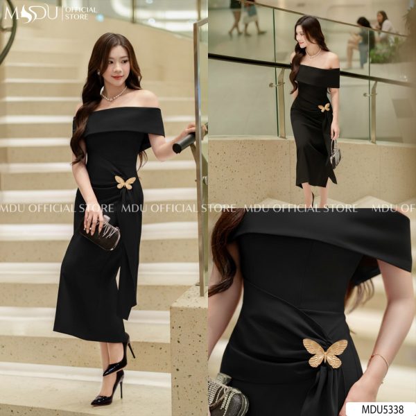 MDU5338 – SOPHISTICATED BLACK OFF-SHOULDER MIDI DRESS WITH FLORAL ACCENT