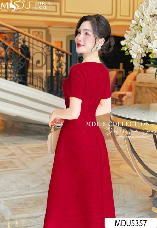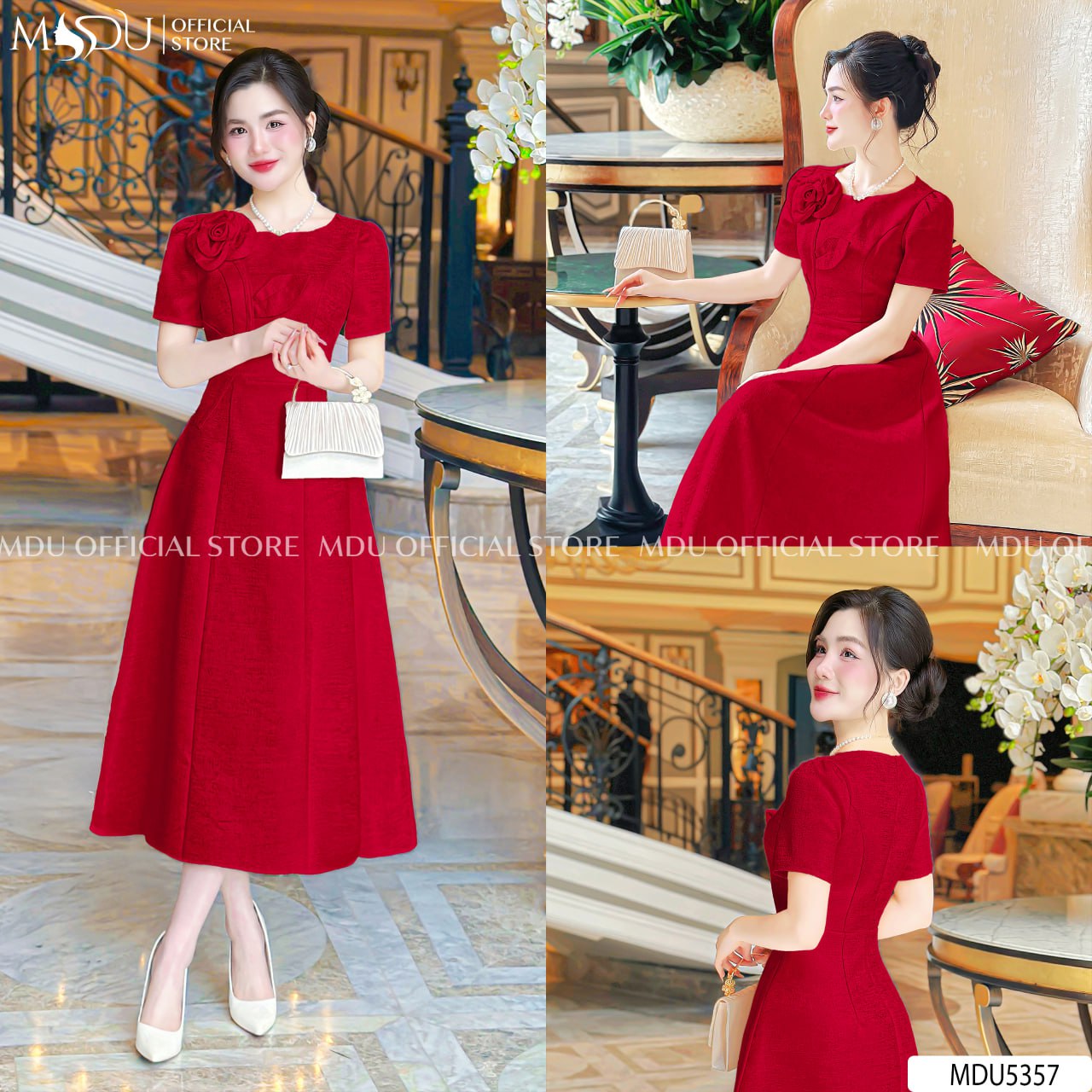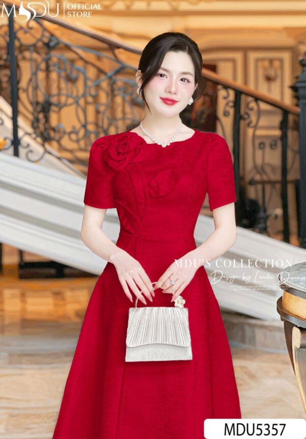 MDU5357 – ELEGANT RED TEXTURED MIDI DRESS WITH FLORAL DETAIL