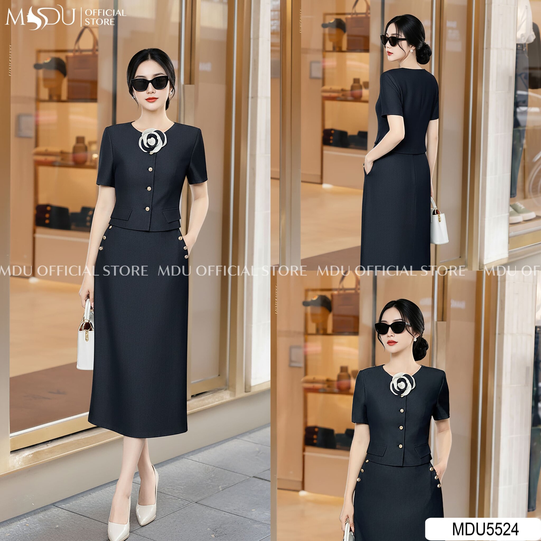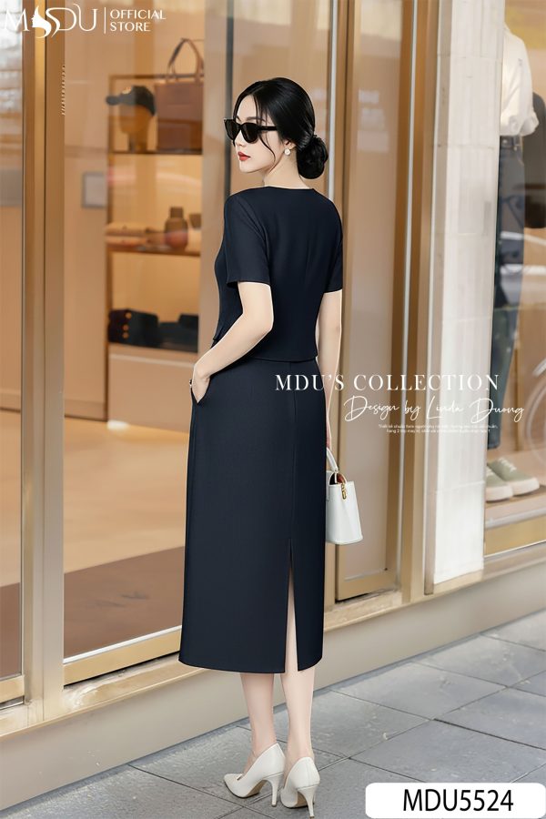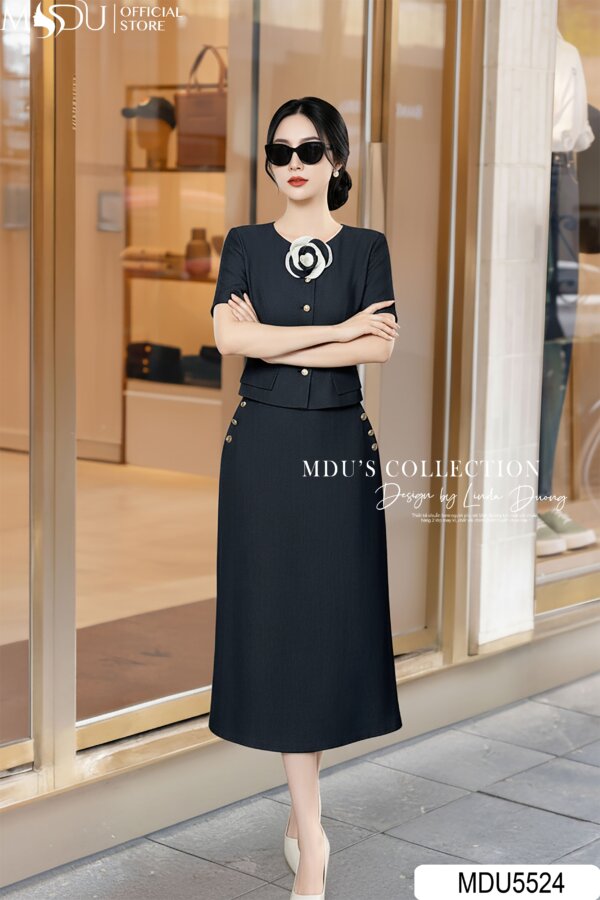 The embodiment of understated luxury, MDU5524 redefines modern sophistication through precision tailoring and refined details. Crafted from a smooth crepe blend, the dress features a clean round neckline and a sculpted bodice accented with elegant gold-tone buttons. The waistline is subtly fitted to flatter the figure, while the midi-length skirt flows with quiet grace. A signature floral brooch at the neckline adds a feminine focal point, balancing softness and power in perfect harmony. Ideal for luncheons, business meetings, or elegant social events.
