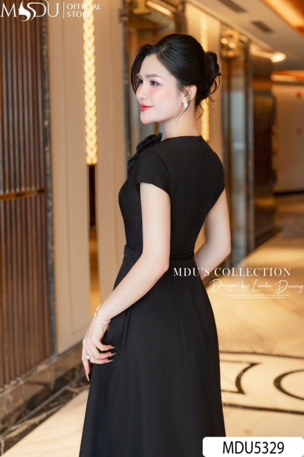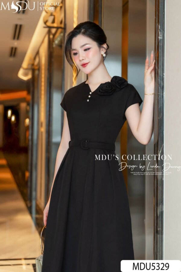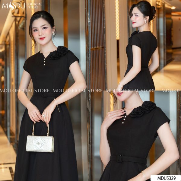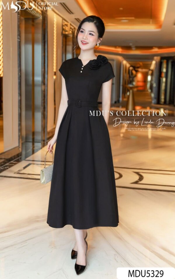MDU5329 embodies quiet sophistication through its minimalist black tone and refined tailoring. The design features a soft round neckline adorned with pearl-like buttons, adding subtle radiance to its elegant form. A fabric belt gently defines the waist, while the flared skirt flows gracefully to mid-calf length, ensuring both comfort and poise. The floral appliqué at the shoulder becomes a symbolic detail — delicate yet powerful — enhancing the timeless appeal of this classic black dress. Ideal for formal luncheons, evening receptions, or any occasion where understated luxury makes the statement.