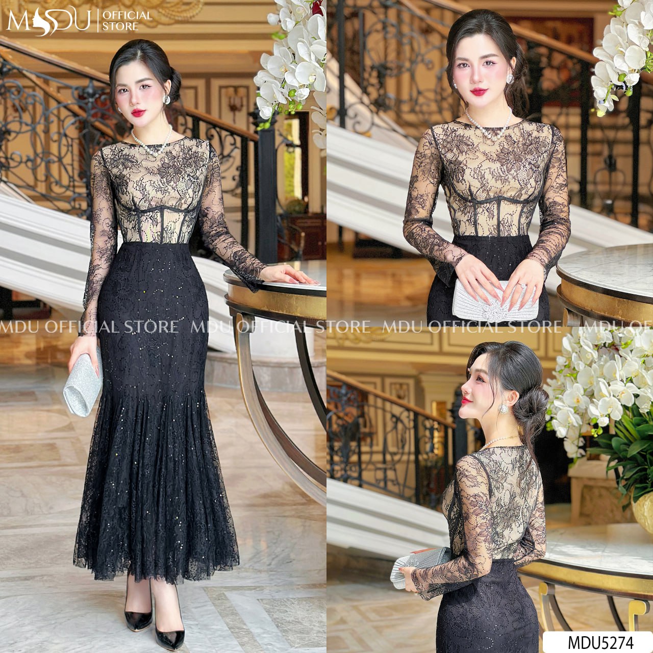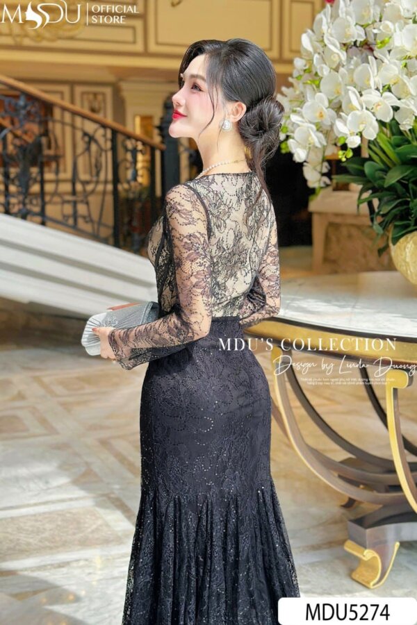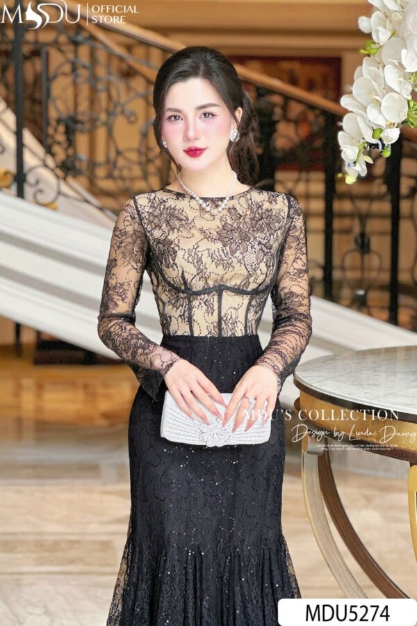 MDU5274 captures the essence of luxury eveningwear with its intricate lace craftsmanship and subtle shimmer. The upper bodice features sheer black lace over a nude-toned base, creating an alluring contrast that evokes both sophistication and mystery. The long lace sleeves lend refinement, while the fitted waist and flared hem form a beautifully balanced mermaid silhouette. Scattered sequins glimmer with every step, offering a graceful radiance under evening lights. Designed for gala events, formal dinners, or special celebrations, this dress transforms elegance into an unforgettable statement.