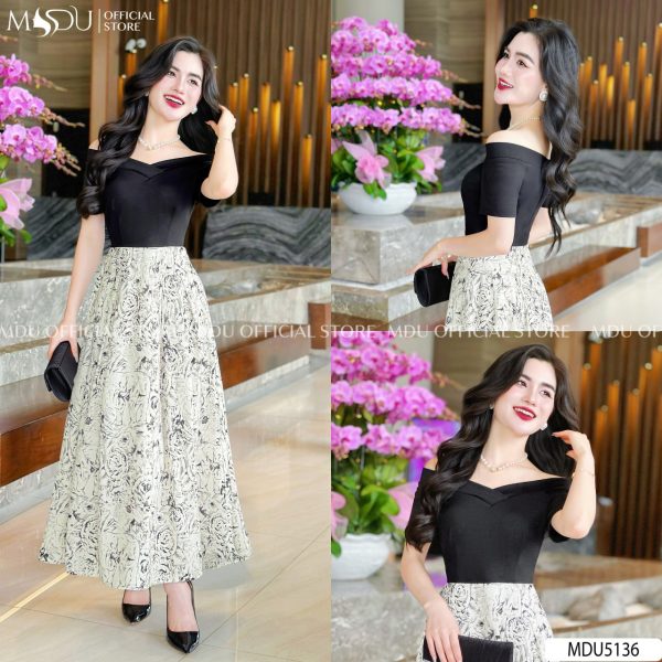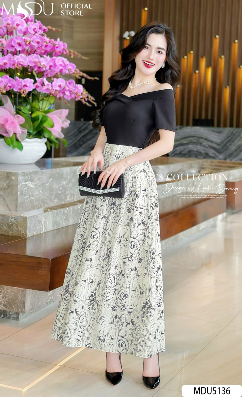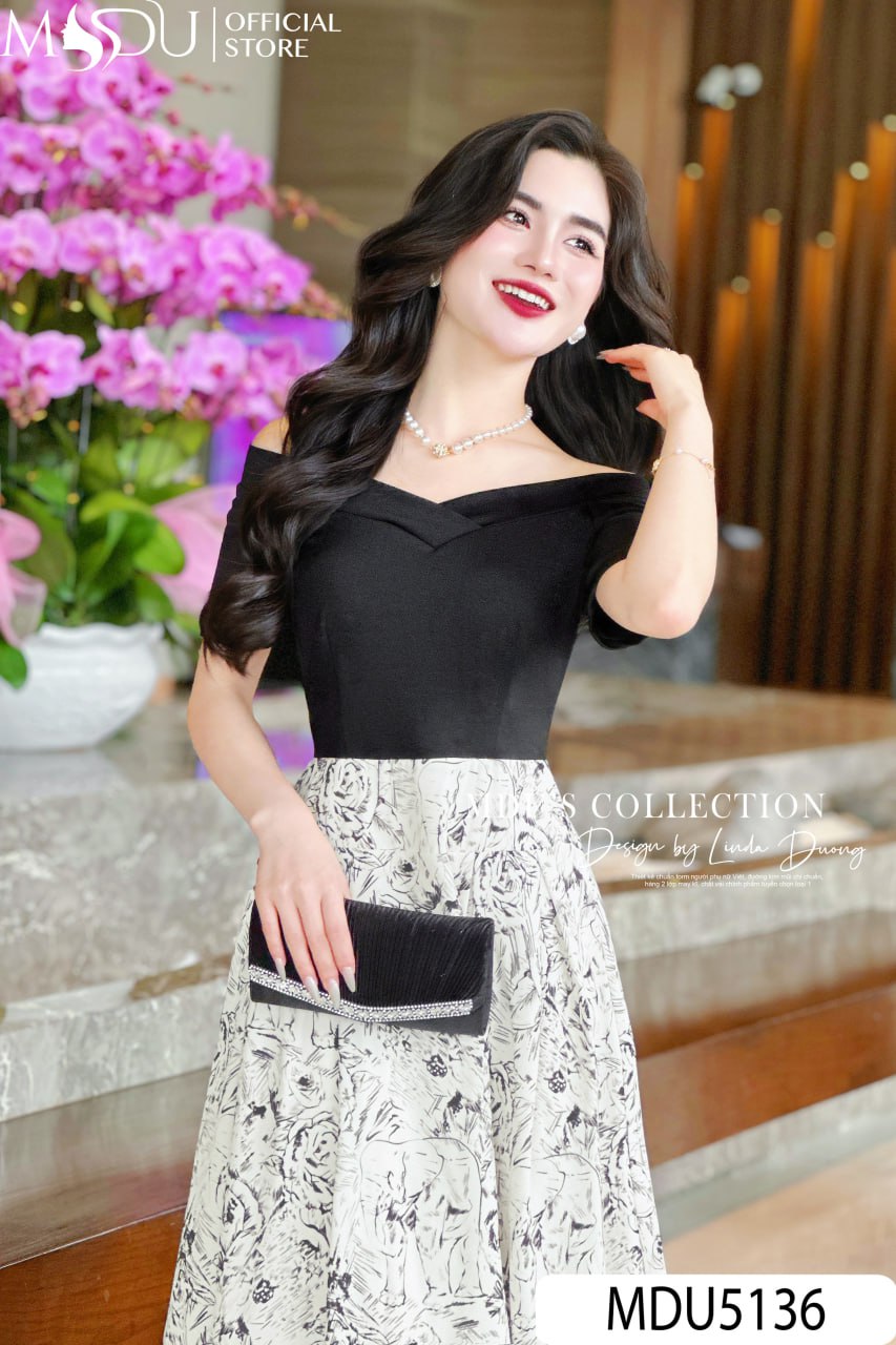 A black satin off-shoulder dress paired with an ivory floral taffeta skirt. MDU5136 exudes luxury and timeless elegance — a sophisticated choice for formal dinners and exclusive events.