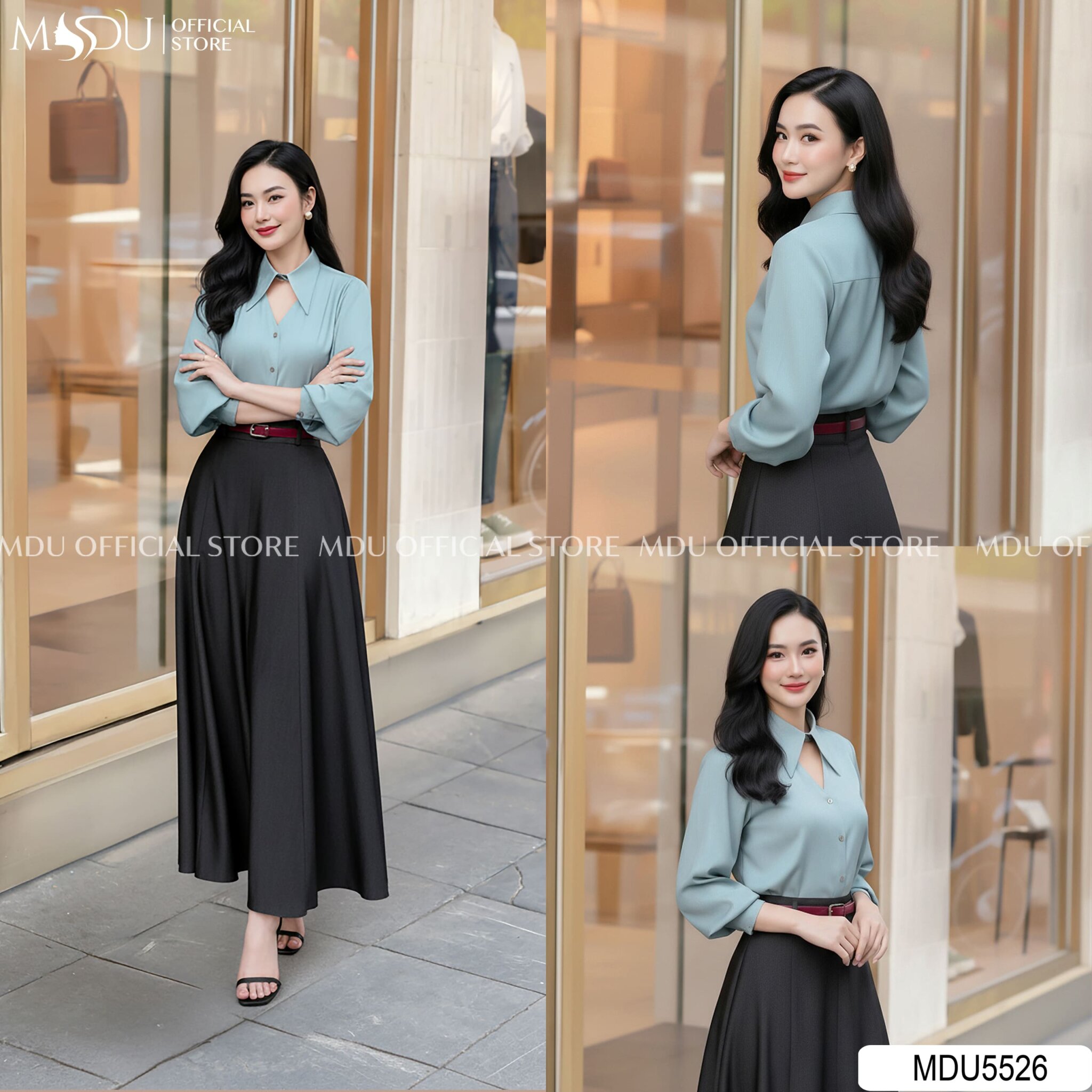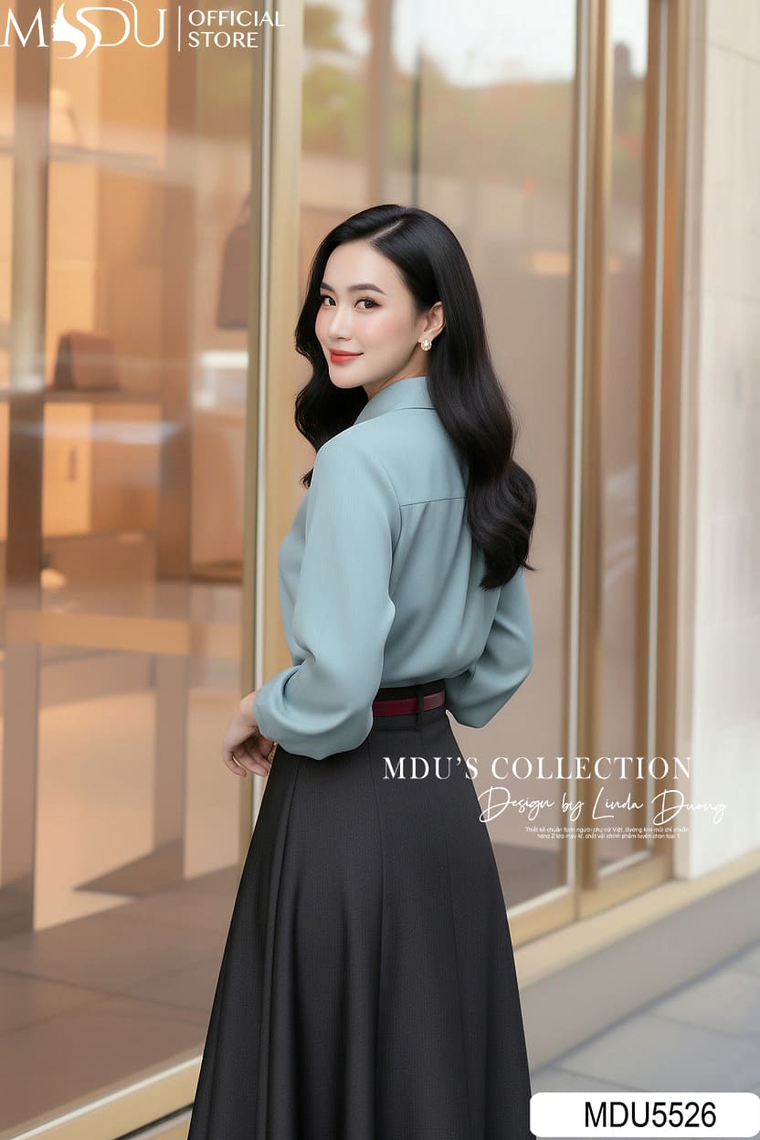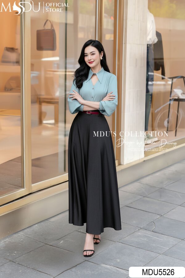 Effortlessly refined, this ensemble celebrates minimalist sophistication through contrast and movement. The sky-blue blouse, tailored with a pointed collar and subtle front cutout, exudes quiet confidence. Paired with a flowing black A-line maxi skirt, the look captures the perfect balance of poise and comfort. The adjustable belt accentuates the waist, creating a timeless silhouette suitable for both professional and social settings. Perfect for women who appreciate understated elegance and timeless charm.