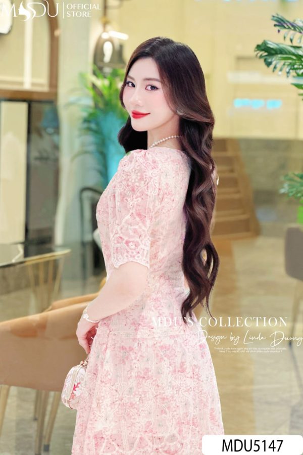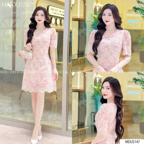 Design Highlights: MDU5147 embodies timeless femininity with a delicate lace texture in romantic blush pink. The short-sleeved mini dress features a gentle V-neckline that frames the collarbone elegantly, while the tailored bodice with decorative front buttons creates a refined, flattering fit. Scalloped lace hems add a touch of sophistication and craftsmanship, evoking the charm of Parisian couture. Perfect for brunch dates, semi-formal gatherings, or afternoon events, this piece enhances your elegance with every graceful movement.