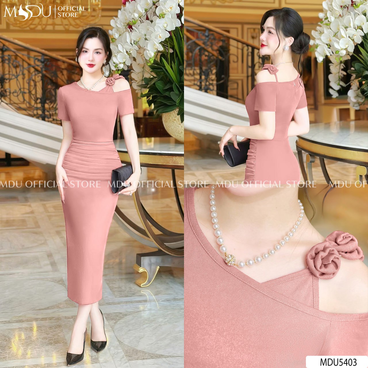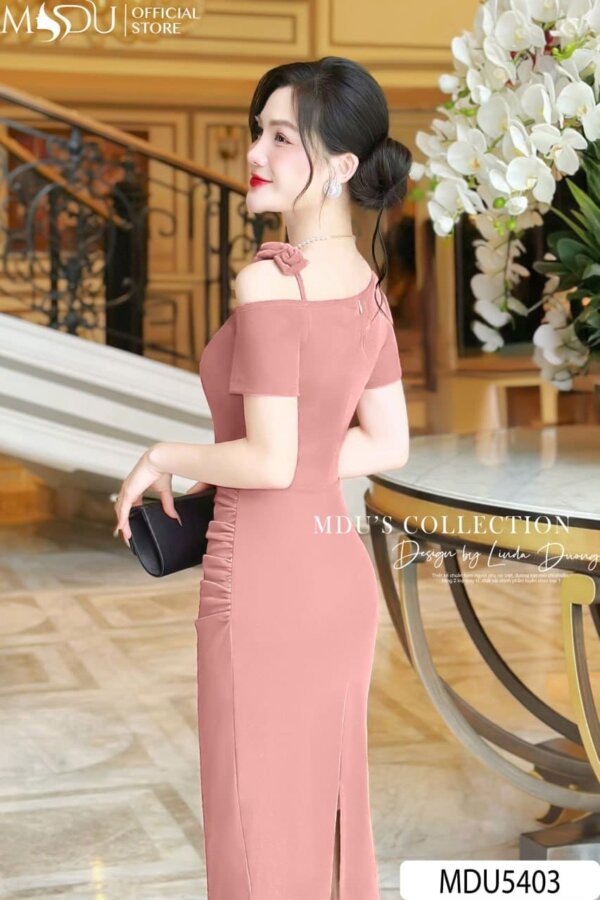 MDU5403 celebrates the art of modern femininity through its rose-pink hue and masterfully contoured silhouette. Designed with a one-shoulder cut and handcrafted floral applique, this piece strikes the perfect balance between allure and grace. The soft stretch of the fabric embraces natural curves while maintaining refined elegance. Subtle gathering along the waistline sculpts a harmonious shape, creating a confident and effortlessly charming look. Ideal for cocktail parties, evening receptions, or elegant dinners where sophistication takes center stage.