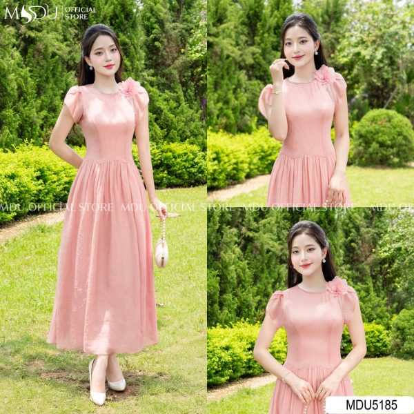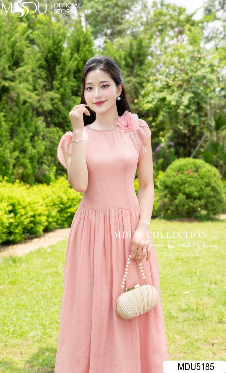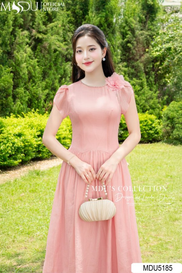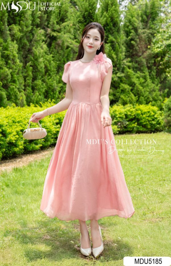 Design Highlights: MDU5185 captures the tender essence of feminine elegance with its soft blush-pink tone and gentle flow. The design features delicate petal sleeves and a floral embellishment on the shoulder, adorned with subtle draping chains for a touch of luxury. The fitted waistline harmoniously transitions into a voluminous midi skirt, creating a silhouette that moves like poetry in motion. Perfect for garden parties, afternoon tea, or elegant gatherings, this dress exudes timeless charm and grace — a beautiful ode to refined femininity.