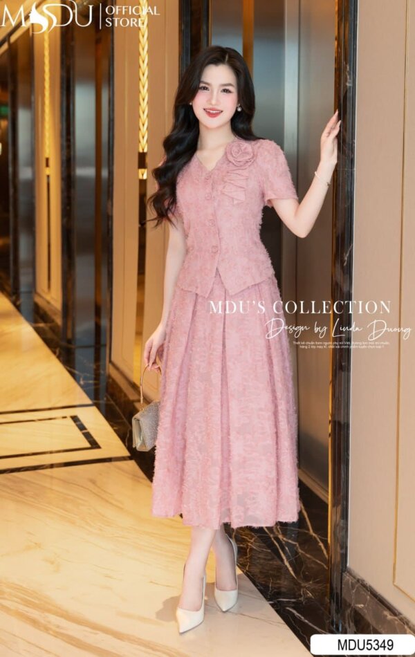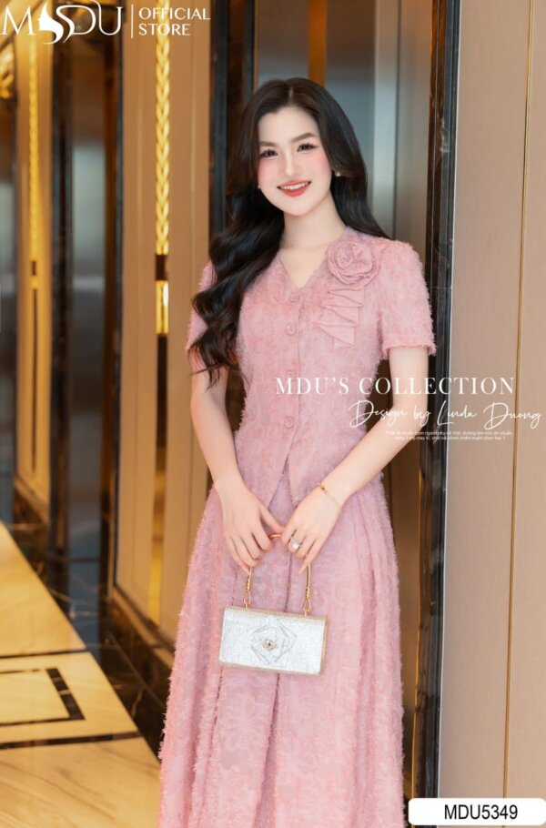 MDU5349 captures the romantic essence of modern femininity with its charming rose-pink tone and meticulously tailored silhouette. The fitted bodice, detailed with gentle pleats and a sculpted flower accent at the chest, exudes grace and sophistication. Short sleeves offer a balanced, polished appearance, while the flowing midi-length skirt adds an effortless movement with every step. The intricate lace overlay creates depth and elegance, making this design a timeless statement for special luncheons, elegant receptions, or formal occasions that call for quiet confidence and refined charm.
