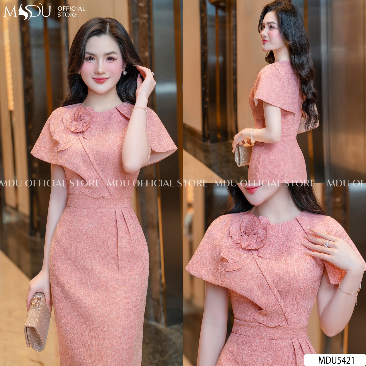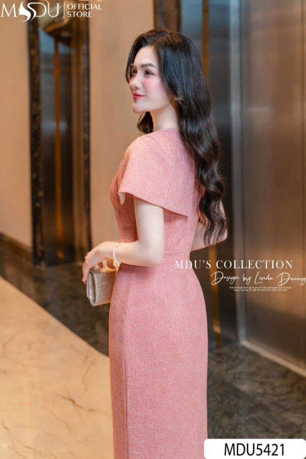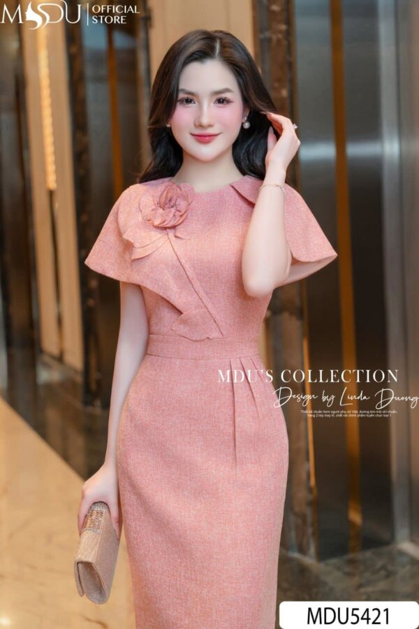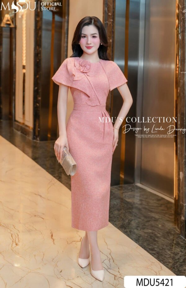 MDU5421 celebrates modern sophistication through timeless tailoring. Crafted from a luxurious tweed-blend fabric, this midi dress features a sculpted silhouette that flatters the feminine form while maintaining ease of movement. The statement cape collar adds graceful drama, complemented by a handcrafted 3D flower that accentuates the neckline with subtle allure. Its fitted waist transitions into a sleek pencil skirt, making it an ideal choice for elegant soirées, high-end meetings, or formal events. The design harmonizes structure and softness, empowering women to exude quiet confidence and refined charm.